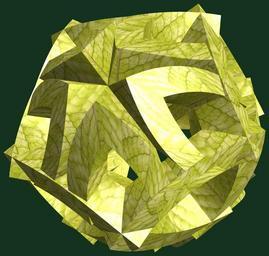 | Keywords: mathematica 3d cg parametricplot3d texture torus code program algorithm プログラム コード アルゴリズム 輪環 りんかん ドーナツ どーなつ 五芒星 ごぼうせい geometric sculpture geometricsculpture shape geometry sculpture mapping テクスチャ マッピング 模様 もよう abstract 抽象 ちゅうしょう アブストラクト design pattern デザイン パターン graphic グラフィック グラフィクス structure 意匠 構造 symmetry 対称性 たいしょうせい シンメトリー 対称 たいしょう leaf plant foliage outdoor a = 3; (* center hole size *) b = 5; (* penta-torus *) c = -5; (* distance from the center of rotation *) d = 5; (* number of torus *) h = 1; (* height of a torus *) SetOptions[ParametricPlot3D, PlotRange -> Full, Mesh -> None, Boxed -> False, Axes -> False, PlotPoints -> 400, ImageSize -> 3000, Background -> RGBColor[{20, 50, 30}/255], PlotStyle -> Directive[Specularity[White, 30], Texture[Import["D:/tmp/71.jpg"]]], TextureCoordinateFunction -> ({#4, #5 Pi} &), Lighting -> "Neutral"]; f[v_] := TriangleWave[{-1, 1}, v/(2 Pi)]; g[v_] := TriangleWave[{-1, 1}, v/(2 Pi) + 1/4]; x = (a - g[t] - f[b s]) Cos[s + 3 Pi/(4 b)]; y = (a - g[t] - f[b s]) Sin[s + 3 Pi/(4 b)]; z = (a - f[t] - h f[b s]) + c; rm = Table[{x, y, z}.RotationMatrix[2 i Pi/d, {1, 1, 0}], {i, d}]; ParametricPlot3D[rm, {t, 0, 2 Pi}, {s, 0, Pi}] (*--- The Texture *) a = 3; (* center hole size *) b = 5; (* penta-torus *) c = -5; (* distance from the center of rotation *) d = 5; (* number of torus *) h = 1; (* height of a torus *) SetOptions[ParametricPlot3D, PlotRange -> Full, Mesh -> None, Boxed -> False, Axes -> False, PlotPoints -> 400, ImageSize -> 3000, Background -> RGBColor[{20, 50, 30}/255], PlotStyle -> Directive[Specularity[White, 30], Texture[Import["D:/tmp/71.jpg"]]], TextureCoordinateFunction -> ({#4, #5 Pi} &), Lighting -> "Neutral"]; f[v_] := TriangleWave[{-1, 1}, v/(2 Pi)]; g[v_] := TriangleWave[{-1, 1}, v/(2 Pi) + 1/4]; x = (a - g[t] - f[b s]) Cos[s + 3 Pi/(4 b)]; y = (a - g[t] - f[b s]) Sin[s + 3 Pi/(4 b)]; z = (a - f[t] - h f[b s]) + c; rm = Table[{x, y, z}.RotationMatrix[2 i Pi/d, {1, 1, 0}], {i, d}]; ParametricPlot3D[rm, {t, 0, 2 Pi}, {s, 0, Pi}] (*--- The Texture *) |