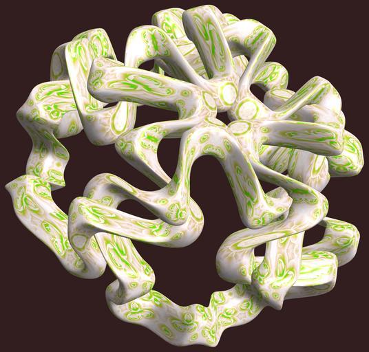 Keywords: mathematica 3d cg parametricplot3d texture torus 輪環 りんかん ドーナツ どーなつ 五芒星 ごぼうせい 五光星 ごこうせい 五稜星 ごりょうせい code program algorithm コード プログラム アルゴリズム pentagram geometric sculpture geometricsculpture shape geometry sculpture mapping テクスチャ マッピング 模様 もよう abstract 抽象 ちゅうしょう アブストラクト design pattern デザイン パターン graphic グラフィック グラフィクス structure 意匠 構造 symmetry 対称性 たいしょうせい シンメトリー 対称 たいしょう algorithm コード black background organic pattern foliage plant flower bouquet indoor a = 5; (* center hole size of a torus *) b = 5; (* penta-torus *) c = -8; (* distance from the center of rotation *) d = 5; (* number of torus *) h = 2; (* height of a torus *) SetOptions[ParametricPlot3D, PlotRange -> Full, Mesh -> None, Boxed -> False, Axes -> False, PlotPoints -> 400, ImageSize -> 3000, Background -> RGBColor[{50, 30, 30}/255], PlotStyle -> Directive[Specularity[White, 70], Texture[Import["D:/tmp/864.jpg"]]], TextureCoordinateFunction -> ({#4, #5 2 Pi} &), Lighting -> "Neutral"]; f[v_] := Sin[2 Sin[Sin[Sin[v]]]]; x = (a - Cos[t] - Sin[b s]) Cos[s + Pi/(2 b)]; y = (a - Cos[t] - Sin[b s]) Sin[s + Pi/(2 b)]; z = (f[t] - h f[b s]) + c; rm = Table[{x, y, z}.RotationMatrix[2 i Pi/d, {1, 1, 1}], {i, d}]; ParametricPlot3D[rm, {t, 0, 2 Pi}, {s, 0, 2 Pi}] (*--- The Texture *) a = 5; (* center hole size of a torus *) b = 5; (* penta-torus *) c = -8; (* distance from the center of rotation *) d = 5; (* number of torus *) h = 2; (* height of a torus *) SetOptions[ParametricPlot3D, PlotRange -> Full, Mesh -> None, Boxed -> False, Axes -> False, PlotPoints -> 400, ImageSize -> 3000, Background -> RGBColor[{50, 30, 30}/255], PlotStyle -> Directive[Specularity[White, 70], Texture[Import["D:/tmp/864.jpg"]]], TextureCoordinateFunction -> ({#4, #5 2 Pi} &), Lighting -> "Neutral"]; f[v_] := Sin[2 Sin[Sin[Sin[v]]]]; x = (a - Cos[t] - Sin[b s]) Cos[s + Pi/(2 b)]; y = (a - Cos[t] - Sin[b s]) Sin[s + Pi/(2 b)]; z = (f[t] - h f[b s]) + c; rm = Table[{x, y, z}.RotationMatrix[2 i Pi/d, {1, 1, 1}], {i, d}]; ParametricPlot3D[rm, {t, 0, 2 Pi}, {s, 0, 2 Pi}] (*--- The Texture *) |
