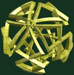| Keywords: mathematica 3d cg parametricplot3d texture torus code program algorithm プログラム コード アルゴリズム 輪環 りんかん ドーナツ どーなつ 五芒星 ごぼうせい geometric sculpture geometricsculpture shape geometry sculpture mapping テクスチャ マッピング 模様 もよう abstract 抽象 ちゅうしょう アブストラクト design pattern デザイン パターン graphic グラフィック グラフィクス structure 意匠 構造 symmetry 対称性 たいしょうせい シンメトリー 対称 たいしょう outdoor a = 12; (* center hole size *) b = 5; (* penta-torus *) c = -15; (* distance from the center of rotation *) d = 5; (* number of torus *) h = 4; (* height of a torus *) SetOptions[ParametricPlot3D, PlotRange -> Full, Mesh -> None, Boxed -> False, Axes -> False, PlotPoints -> 400, ImageSize -> 3000, Background -> RGBColor[{20, 50, 30}/255], PlotStyle -> Directive[Specularity[White, 30], Texture[Import["D:/tmp/71.jpg"]]], TextureCoordinateFunction -> ({#4, #5 Pi} &), Lighting -> "Neutral"]; f[v_] := TriangleWave[{-1, 1}, v/(2 Pi)]; g[v_] := TriangleWave[{-1, 1}, v/(2 Pi) + 1/4]; x = (a - g[t] - f[b s]) Cos[s + 3 Pi/(4 b)]; y = (a - g[t] - f[b s]) Sin[s + 3 Pi/(4 b)]; z = (a - f[t] - h f[b s]) + c; rm = Table[{x, y, z}.RotationMatrix[2 i Pi/d, {1, 1, 0}], {i, d}]; ParametricPlot3D[rm, {t, 0, 2 Pi}, {s, 0, Pi}] (*--- The Texture *) a = 12; (* center hole size *) b = 5; (* penta-torus *) c = -15; (* distance from the center of rotation *) d = 5; (* number of torus *) h = 4; (* height of a torus *) SetOptions[ParametricPlot3D, PlotRange -> Full, Mesh -> None, Boxed -> False, Axes -> False, PlotPoints -> 400, ImageSize -> 3000, Background -> RGBColor[{20, 50, 30}/255], PlotStyle -> Directive[Specularity[White, 30], Texture[Import["D:/tmp/71.jpg"]]], TextureCoordinateFunction -> ({#4, #5 Pi} &), Lighting -> "Neutral"]; f[v_] := TriangleWave[{-1, 1}, v/(2 Pi)]; g[v_] := TriangleWave[{-1, 1}, v/(2 Pi) + 1/4]; x = (a - g[t] - f[b s]) Cos[s + 3 Pi/(4 b)]; y = (a - g[t] - f[b s]) Sin[s + 3 Pi/(4 b)]; z = (a - f[t] - h f[b s]) + c; rm = Table[{x, y, z}.RotationMatrix[2 i Pi/d, {1, 1, 0}], {i, d}]; ParametricPlot3D[rm, {t, 0, 2 Pi}, {s, 0, Pi}] (*--- The Texture *) |
