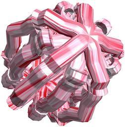 | Keywords: mathematica 3d cg parametricplot3d texture torus 輪環 りんかん ドーナツ どーなつ 五芒星 ごぼうせい 五光星 五稜星 ごこうせい ごりょうせい program プログラム code コード algorithm コード アルゴリズム pentagram geometric sculpture geometricsculpture shape geometry sculpture mapping テクスチャ マッピング 模様 もよう design pattern デザイン パターン graphic グラフィック グラフィクス structure 意匠 構造 symmetry 対称性 たいしょうせい シンメトリー 対称 たいしょう algorithm white background SetOptions[ParametricPlot3D, PlotRange -> Full, Mesh -> None, Boxed -> False, Axes -> None, PlotPoints -> 300, ImageSize -> 3000, PlotStyle -> Directive[Specularity[White, 30], Texture[Import["D:/tmp/86.jpg"]]], TextureCoordinateFunction -> ({#4 + #5, #5/Pi} &), Lighting -> "Neutral"]; a = 6; (* center hole size of a torus *) b = 5; (* penta-torus *) c = 3; (* 3-partial sum of the Fourier series for Square wave *) f[v_] := Sum[TriangleWave[{-1, 1}, (2 k - 1) v]/(2 k - 1), {k, c}]; g[v_] := Sum[TriangleWave[{-1, 1}, (2 k - 1) (v + 1/4)]/(2 k - 1), {k, c}]; x = (a - f[t] - g[b s]) f[s]; y = g[t]; z = (a - f[t] - g[b s]) g[s]; rot = Table[{x, y, z}.RotationMatrix[2 i Pi /b, {1, 0, 0}], {i, b}]; ParametricPlot3D[rot, {t, 0, 1}, {s, 0, 1}] (* --- The Texture *) SetOptions[ParametricPlot3D, PlotRange -> Full, Mesh -> None, Boxed -> False, Axes -> None, PlotPoints -> 300, ImageSize -> 3000, PlotStyle -> Directive[Specularity[White, 30], Texture[Import["D:/tmp/86.jpg"]]], TextureCoordinateFunction -> ({#4 + #5, #5/Pi} &), Lighting -> "Neutral"]; a = 6; (* center hole size of a torus *) b = 5; (* penta-torus *) c = 3; (* 3-partial sum of the Fourier series for Square wave *) f[v_] := Sum[TriangleWave[{-1, 1}, (2 k - 1) v]/(2 k - 1), {k, c}]; g[v_] := Sum[TriangleWave[{-1, 1}, (2 k - 1) (v + 1/4)]/(2 k - 1), {k, c}]; x = (a - f[t] - g[b s]) f[s]; y = g[t]; z = (a - f[t] - g[b s]) g[s]; rot = Table[{x, y, z}.RotationMatrix[2 i Pi /b, {1, 0, 0}], {i, b}]; ParametricPlot3D[rot, {t, 0, 1}, {s, 0, 1}] (* --- The Texture *) |