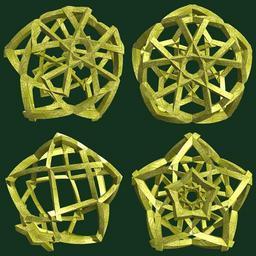 | Keywords: mathematica 3d cg parametricplot3d texture torus code program algorithm プログラム コード アルゴリズム 輪環 りんかん ドーナツ どーなつ 五芒星 ごぼうせい geometric sculpture geometricsculpture shape geometry sculpture mapping テクスチャ マッピング 模様 もよう abstract 抽象 ちゅうしょう アブストラクト design pattern デザイン パターン graphic グラフィック グラフィクス structure 意匠 構造 symmetry 対称性 たいしょうせい シンメトリー 対称 たいしょう tangle black background indoor curve a = 12; (* center hole size *) b = 5; (* penta-torus *) c = -11; (* distance from the center of rotation *) d = 5; (* number of torus *) h = 4; (* height of a torus *) SetOptions[ParametricPlot3D, PlotRange -> Full, Mesh -> None, Boxed -> False, Axes -> False, PlotPoints -> 400, ImageSize -> 3000, Background -> RGBColor[{20, 50, 30}/255], PlotStyle -> Directive[Specularity[White, 30], Texture[Import["D:/tmp/71.jpg"]]], TextureCoordinateFunction -> ({#4, #5 Pi} &), Lighting -> "Neutral"]; f[v_] := TriangleWave[{-1, 1}, v/(2 Pi)]; g[v_] := TriangleWave[{-1, 1}, v/(2 Pi) + 1/4]; x = (a - g[t] - f[b s]) Cos[s + 3 Pi/(4 b)]; y = (a - g[t] - f[b s]) Sin[s + 3 Pi/(4 b)]; z = (a - f[t] - h f[b s]) + c; rm = Table[{x, y, z}.RotationMatrix[2 i Pi/d, {1, 1, 0}], {i, d}]; ParametricPlot3D[rm, {t, 0, 2 Pi}, {s, 0, Pi}] (*--- The Texture *) a = 12; (* center hole size *) b = 5; (* penta-torus *) c = -11; (* distance from the center of rotation *) d = 5; (* number of torus *) h = 4; (* height of a torus *) SetOptions[ParametricPlot3D, PlotRange -> Full, Mesh -> None, Boxed -> False, Axes -> False, PlotPoints -> 400, ImageSize -> 3000, Background -> RGBColor[{20, 50, 30}/255], PlotStyle -> Directive[Specularity[White, 30], Texture[Import["D:/tmp/71.jpg"]]], TextureCoordinateFunction -> ({#4, #5 Pi} &), Lighting -> "Neutral"]; f[v_] := TriangleWave[{-1, 1}, v/(2 Pi)]; g[v_] := TriangleWave[{-1, 1}, v/(2 Pi) + 1/4]; x = (a - g[t] - f[b s]) Cos[s + 3 Pi/(4 b)]; y = (a - g[t] - f[b s]) Sin[s + 3 Pi/(4 b)]; z = (a - f[t] - h f[b s]) + c; rm = Table[{x, y, z}.RotationMatrix[2 i Pi/d, {1, 1, 0}], {i, d}]; ParametricPlot3D[rm, {t, 0, 2 Pi}, {s, 0, Pi}] (*--- The Texture *) |