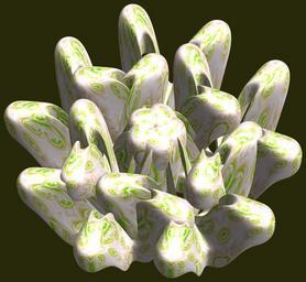 | Keywords: mathematica 3d cg parametricplot3d texture torus 輪環 りんかん ドーナツ どーなつ 五芒星 ごぼうせい 五光星 ごこうせい 五稜星 ごりょうせい code program algorithm コード プログラム アルゴリズム pentagram geometric sculpture geometricsculpture shape geometry sculpture mapping テクスチャ マッピング 模様 もよう abstract 抽象 ちゅうしょう アブストラクト design pattern デザイン パターン graphic グラフィック グラフィクス structure 意匠 構造 symmetry 対称性 たいしょうせい シンメトリー 対称 たいしょう algorithm コード black background organic pattern blossom plant flower a = 2; (* center hole size of a torus *) b = 5; (* penta-torus *) c = 2; (* distance from the center of rotation *) d = 5; (* number of torus *) h = 2; (* height of a torus *) SetOptions[ParametricPlot3D, PlotRange -> Full, Mesh -> None, Boxed -> False, Axes -> False, PlotPoints -> 400, ImageSize -> 3000, Background -> RGBColor[{40, 40, 10}/255], PlotStyle -> Directive[Specularity[White, 70], Texture[Import["D:/tmp/864.jpg"]]], TextureCoordinateFunction -> ({#4, #5 2 Pi} &), Lighting -> "Neutral"]; f[v_] := Sin[2 Sin[Sin[Sin[v]]]]; x = (a - Cos[t] - Sin[b s]) Cos[s + Pi/(2 b)] + c; y = (a - Cos[t] - Sin[b s]) Sin[s + Pi/(2 b)] + c; z = (f[t] - h f[b s]) + c; rot = Table[{x, y, z}.RotationMatrix[2 i Pi/d, {0, 0, 1}], {i, d}]; ParametricPlot3D[rot, {t, 0, 2 Pi}, {s, 0, 2 Pi}] (*--- The Texture *) a = 2; (* center hole size of a torus *) b = 5; (* penta-torus *) c = 2; (* distance from the center of rotation *) d = 5; (* number of torus *) h = 2; (* height of a torus *) SetOptions[ParametricPlot3D, PlotRange -> Full, Mesh -> None, Boxed -> False, Axes -> False, PlotPoints -> 400, ImageSize -> 3000, Background -> RGBColor[{40, 40, 10}/255], PlotStyle -> Directive[Specularity[White, 70], Texture[Import["D:/tmp/864.jpg"]]], TextureCoordinateFunction -> ({#4, #5 2 Pi} &), Lighting -> "Neutral"]; f[v_] := Sin[2 Sin[Sin[Sin[v]]]]; x = (a - Cos[t] - Sin[b s]) Cos[s + Pi/(2 b)] + c; y = (a - Cos[t] - Sin[b s]) Sin[s + Pi/(2 b)] + c; z = (f[t] - h f[b s]) + c; rot = Table[{x, y, z}.RotationMatrix[2 i Pi/d, {0, 0, 1}], {i, d}]; ParametricPlot3D[rot, {t, 0, 2 Pi}, {s, 0, 2 Pi}] (*--- The Texture *) |