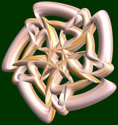 | Keywords: mathematica 3d cg parametricplot3d texture torus 輪環 りんかん ドーナツ どーなつ 五芒星 ごぼうせい ごこうせい 五光星 五稜星 ごりょうせい program プログラム code コード algorithm コード アルゴリズム pentagram geometric sculpture geometricsculpture shape geometry sculpture mapping テクスチャ マッピング 模様 もよう design pattern デザイン パターン graphic グラフィック グラフィクス structure 意匠 構造 symmetry 対称性 たいしょうせい シンメトリー 対称 たいしょう algorithm black background food plant tangle flower SetOptions[ParametricPlot3D, PlotRange -> Full, Mesh -> None, Boxed -> False, Axes -> None, PlotPoints -> 400, ImageSize -> 3000, Background -> Darker[Green, 0.8], PlotStyle -> Directive[Specularity[White, 30], Texture[Import["D:/tmp/861.jpg"]]], TextureCoordinateFunction -> ({#4 + #5, #5/Pi} &), Lighting -> "Neutral"]; a = 4; (* center hole size of a torus *) b = 5; (* penta-torus *) c = 2; (* distance from the center of rotation *) d = 5; (* number of torus *) f[v_] := Sum[Sin[(2 k - 1) v]/(2 k - 1), {k, 4}]; x = (a - Cos[t] - Sin[b s]) Cos[s + Pi/(2 b)] + c; y = Sin[t] + c; z = (a - Cos[t] - Sin[b s]) f[s + Pi/(2 b)] + c; rot = Table[{x, y, z}.RotationMatrix[2 i Pi/d, {0, 1, 0}], {i, d}]; ParametricPlot3D[rot, {t, 0, 2 Pi}, {s, 0, 2 Pi}] (*--- The Texture The g[] is a 4-partial sum of the Fourier series for Square wave. g[]は矩形波のフーリエ展開の最初の4項 *) SetOptions[ParametricPlot3D, PlotRange -> Full, Mesh -> None, Boxed -> False, Axes -> None, PlotPoints -> 400, ImageSize -> 3000, Background -> Darker[Green, 0.8], PlotStyle -> Directive[Specularity[White, 30], Texture[Import["D:/tmp/861.jpg"]]], TextureCoordinateFunction -> ({#4 + #5, #5/Pi} &), Lighting -> "Neutral"]; a = 4; (* center hole size of a torus *) b = 5; (* penta-torus *) c = 2; (* distance from the center of rotation *) d = 5; (* number of torus *) f[v_] := Sum[Sin[(2 k - 1) v]/(2 k - 1), {k, 4}]; x = (a - Cos[t] - Sin[b s]) Cos[s + Pi/(2 b)] + c; y = Sin[t] + c; z = (a - Cos[t] - Sin[b s]) f[s + Pi/(2 b)] + c; rot = Table[{x, y, z}.RotationMatrix[2 i Pi/d, {0, 1, 0}], {i, d}]; ParametricPlot3D[rot, {t, 0, 2 Pi}, {s, 0, 2 Pi}] (*--- The Texture The g[] is a 4-partial sum of the Fourier series for Square wave. g[]は矩形波のフーリエ展開の最初の4項 *) |