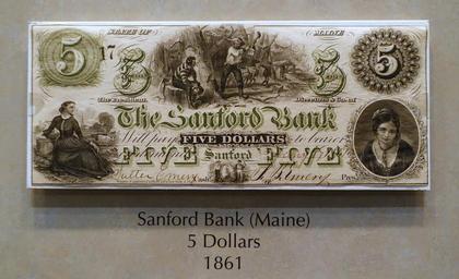 | Keywords: 5 Dollars, Sanford Bank, Maine, 1861 - National Museum of American History - DSC00199.jpg en Exhibit in the National Museum of American History Washington DC USA Photography was permitted in the museum without restriction 2015-03-27 11 29 58 own Daderot other versions cc-zero Banknotes in the National Museum of American History Local currencies of the United States | ||||