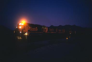 | Keywords: santa fe santafe at&sf atsf outdoor sky Roger was clearly experimenting -- playing with light. He threw out what he considered the failures. I say that because I'll find a group of slides taken of the same subject and by the slide numbers Kodak stamped on the slide mounts maybe 50% or more are missing. 2. AT&SF in January 1983. He must have timed the shot so the rotating beacon was aimed right at the camera. Roger was clearly experimenting -- playing with light. He threw out what he considered the failures. I say that because I'll find a group of slides taken of the same subject and by the slide numbers Kodak stamped on the slide mounts maybe 50% or more are missing. 2. AT&SF in January 1983. He must have timed the shot so the rotating beacon was aimed right at the camera. |
