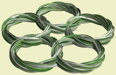 | Keywords: mathematica 3d cg parametricplot3d texture torus code program algorithm プログラム コード アルゴリズム 輪環 りんかん ドーナツ どーなつ トーラス とーらす knot 結び目 むすびめ mapping テクスチャ マッピング 模様 もよう design pattern デザイン パターン graphic グラフィック グラフィクス structure 意匠 構造 symmetry 対称性 たいしょうせい シンメトリー 対称 たいしょう indoor white background drawing cable a = 13; (* center hole size of a torus *) b1 = 9;(* the number of angles *) b2 = 4;(* the number of waves *) b3 = 4; (* the number of knots *) c = 14; (* distance from the center of rotation *) d = 5; (* the number of tori *) h1 = 1; (* width of a torus *) h2 = 1; (* width of a torus *) h3 = 2; (* height of cross *) SetOptions[ParametricPlot3D, PlotRange -> Full, Mesh -> None, Boxed -> False, Axes -> None, PlotPoints -> 500, ImageSize -> 3000, Background -> RGBColor[{240, 240, 200}/255], PlotStyle -> Directive[Specularity[White, 50], Texture[Import["D:/tmp/911.jpg"]]], TextureCoordinateFunction -> ({#4, #5 /Pi} &), Lighting -> "Neutral"]; x = (a - h1 Cos[t] + h2 Sin[b1 s]) Cos[b3 s] + c; y = (a - h1 Cos[t] + h2 Sin[b1 s]) Sin[b3 s] + c; z = h3 Cos[b1 s] + Sin[b2 t] + c; rm = Table[{x, y, z}.RotationMatrix[2 i Pi/d, {0, 0, 1}], {i, d}]; ParametricPlot3D[rm, {t, 0, 2 Pi}, {s, 0, 2 Pi}] (*--- The Texture *) a = 13; (* center hole size of a torus *) b1 = 9;(* the number of angles *) b2 = 4;(* the number of waves *) b3 = 4; (* the number of knots *) c = 14; (* distance from the center of rotation *) d = 5; (* the number of tori *) h1 = 1; (* width of a torus *) h2 = 1; (* width of a torus *) h3 = 2; (* height of cross *) SetOptions[ParametricPlot3D, PlotRange -> Full, Mesh -> None, Boxed -> False, Axes -> None, PlotPoints -> 500, ImageSize -> 3000, Background -> RGBColor[{240, 240, 200}/255], PlotStyle -> Directive[Specularity[White, 50], Texture[Import["D:/tmp/911.jpg"]]], TextureCoordinateFunction -> ({#4, #5 /Pi} &), Lighting -> "Neutral"]; x = (a - h1 Cos[t] + h2 Sin[b1 s]) Cos[b3 s] + c; y = (a - h1 Cos[t] + h2 Sin[b1 s]) Sin[b3 s] + c; z = h3 Cos[b1 s] + Sin[b2 t] + c; rm = Table[{x, y, z}.RotationMatrix[2 i Pi/d, {0, 0, 1}], {i, d}]; ParametricPlot3D[rm, {t, 0, 2 Pi}, {s, 0, 2 Pi}] (*--- The Texture *) |