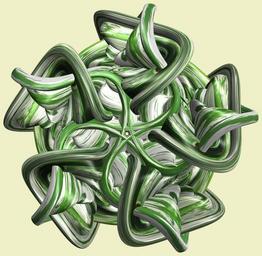 | Keywords: mathematica 3d cg parametricplot3d texture torus code program algorithm プログラム コード アルゴリズム 輪環 りんかん ドーナツ どーなつ トーラス とーらす knot 結び目 むすびめ mapping テクスチャ マッピング 模様 もよう design pattern デザイン パターン graphic グラフィック グラフィクス structure 意匠 構造 symmetry 対称性 たいしょうせい シンメトリー 対称 たいしょう indoor white background tangle a = 4; (* center hole size of a torus *) b1 = 5;(* the number of angles *) b2 = 3;(* the number of waves *) b3 = 2; (* the number of knots *) c = 8; (* distance from the center of rotation *) d = 5; (* the number of tori *) h1 = 3; (* width of a torus *) h2 = 1; (* width of a torus *) h3 = 3; (* height of cross *) SetOptions[ParametricPlot3D, PlotRange -> Full, Mesh -> None, Boxed -> False, Axes -> None, PlotPoints -> 500, ImageSize -> 3000, Background -> RGBColor[{240, 240, 200}/255], PlotStyle -> Directive[Specularity[White, 50], Texture[Import["D:/tmp/911.jpg"]]], TextureCoordinateFunction -> ({#4, #5 /Pi} &), Lighting -> "Neutral"]; x = (a - h1 Cos[t] + h2 Sin[b1 s]) Cos[b3 s] + c; y = (a - h1 Cos[t] + h2 Sin[b1 s]) Sin[b3 s] + c; z = h3 Cos[b1 s] + Sin[b2 t] + c; rm = Table[{x, y, z}.RotationMatrix[2 i Pi/d, {1, 0, 1}], {i, d}]; ParametricPlot3D[rm, {t, 0, 2 Pi}, {s, 0, 2 Pi}] (*--- The Texture *) a = 4; (* center hole size of a torus *) b1 = 5;(* the number of angles *) b2 = 3;(* the number of waves *) b3 = 2; (* the number of knots *) c = 8; (* distance from the center of rotation *) d = 5; (* the number of tori *) h1 = 3; (* width of a torus *) h2 = 1; (* width of a torus *) h3 = 3; (* height of cross *) SetOptions[ParametricPlot3D, PlotRange -> Full, Mesh -> None, Boxed -> False, Axes -> None, PlotPoints -> 500, ImageSize -> 3000, Background -> RGBColor[{240, 240, 200}/255], PlotStyle -> Directive[Specularity[White, 50], Texture[Import["D:/tmp/911.jpg"]]], TextureCoordinateFunction -> ({#4, #5 /Pi} &), Lighting -> "Neutral"]; x = (a - h1 Cos[t] + h2 Sin[b1 s]) Cos[b3 s] + c; y = (a - h1 Cos[t] + h2 Sin[b1 s]) Sin[b3 s] + c; z = h3 Cos[b1 s] + Sin[b2 t] + c; rm = Table[{x, y, z}.RotationMatrix[2 i Pi/d, {1, 0, 1}], {i, d}]; ParametricPlot3D[rm, {t, 0, 2 Pi}, {s, 0, 2 Pi}] (*--- The Texture *) |
