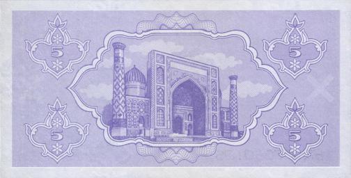 | Keywords: 5 som. Uzbekistan, 1992 b.jpg 5 сум Узбекистана 1992 5 sum of Uzbekistan 1992 own scan 1992 Central Bank of the Republic of Uzbekistan Цент альный банк Республики Узбекистан Ўзбекистон Республикаси а казий банки PD-UZ-exempt banknotes Banknotes of Uzbekistan 1992 Banknotes with Sherdor madrasah drawings Banknotes with a face value of 5 Purple banknotes |