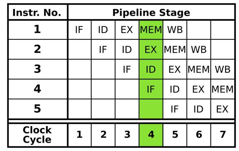 | Keywords: 5 Stage Pipeline.svg en A diagram showing the stage of execution reached by five consecutive instructions in a 5-stage microprocessor At clock cycle 4 the 1st instruction is in the memory access phase the second is in the execute phase the third in the instruction decode phase the fourth in the instruction fetch phase and the fifth hasn't been fetched yet own Inductiveload 2009-01-22 Pipeline diagrams computer science SVG flow charts | ||||