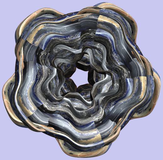 Keywords: mathematica 3d cg parametricplot3d texture torus code program algorithm プログラム コード アルゴリズム 輪環 りんかん ドーナツ どーなつ トーラス とーらす mapping テクスチャ マッピング 模様 もよう abstract 抽象 ちゅうしょう アブストラクト design pattern デザイン パターン graphic グラフィック グラフィクス structure 意匠 構造 symmetry 対称性 たいしょうせい シンメトリー 対称 たいしょう drawing surreal painting door white background architecture a = 7; (* center hole size of a torus *) b1 = 4;(* the number of angles *) b2 = 4;(* the number of waves *) c = 1; (* distance from the center of rotation *) d = 5; (* the number of tori *) h1 = 3; (* width of a torus *) h2 = 1; (* width of a torus *) SetOptions[ParametricPlot3D, PlotRange -> Full, Mesh -> None, Boxed -> False, Axes -> None, PlotPoints -> 500, ImageSize -> 3000, Background -> RGBColor[{200, 200, 240}/255], PlotStyle -> Directive[Specularity[White, 70], Texture[Import["D:/tmp/94.jpg"]]], TextureCoordinateFunction -> ({#4, #5 Pi} &), Lighting -> "Neutral"]; f[v_] := Sin[2 Sin[Sin[Sin[v]]]]; x = (a - h1 Cos[t] + h2 f[b1 s]) Cos[s] + c; y = (a - h1 Cos[t] + h2 f[b1 s]) Sin[s] + c; z = f[b2 t]; rm = Table[{x, y, z}.RotationMatrix[2 i Pi/d, {0, 1, 2}], {i, d}]; ParametricPlot3D[rm, {t, 0, 2 Pi}, {s, 0, 2 Pi}] (*--- The Texture *) a = 7; (* center hole size of a torus *) b1 = 4;(* the number of angles *) b2 = 4;(* the number of waves *) c = 1; (* distance from the center of rotation *) d = 5; (* the number of tori *) h1 = 3; (* width of a torus *) h2 = 1; (* width of a torus *) SetOptions[ParametricPlot3D, PlotRange -> Full, Mesh -> None, Boxed -> False, Axes -> None, PlotPoints -> 500, ImageSize -> 3000, Background -> RGBColor[{200, 200, 240}/255], PlotStyle -> Directive[Specularity[White, 70], Texture[Import["D:/tmp/94.jpg"]]], TextureCoordinateFunction -> ({#4, #5 Pi} &), Lighting -> "Neutral"]; f[v_] := Sin[2 Sin[Sin[Sin[v]]]]; x = (a - h1 Cos[t] + h2 f[b1 s]) Cos[s] + c; y = (a - h1 Cos[t] + h2 f[b1 s]) Sin[s] + c; z = f[b2 t]; rm = Table[{x, y, z}.RotationMatrix[2 i Pi/d, {0, 1, 2}], {i, d}]; ParametricPlot3D[rm, {t, 0, 2 Pi}, {s, 0, 2 Pi}] (*--- The Texture *)
