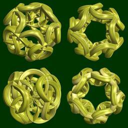 | Keywords: mathematica 3d cg parametricplot3d texture torus 輪環 りんかん ドーナツ どーなつ トーラス code program コード プログラム algorithm コード アルゴリズム geometric sculpture geometricsculpture shape geometry sculpture mapping テクスチャ マッピング 模様 もよう abstract 抽象 ちゅうしょう アブストラクト design pattern デザイン パターン graphic グラフィック グラフィクス structure 意匠 構造 symmetry 対称性 たいしょうせい シンメトリー 対称 たいしょう algorithm indoor a = 5; (* center hole size of a torus *) b1 = 5; (* number of cross *) b2 = 3; (* number of cross *) c = -7; (* distance from the center of rotation *) d = 5; (* number of torus *) w = 4; (* gap width *) SetOptions[ParametricPlot3D, PlotRange -> Full, Mesh -> None, Boxed -> False, Axes -> None, PlotPoints -> 400, ImageSize -> 1600, Background -> Darker[Green, 0.8], PlotStyle -> Directive[Specularity[White, 90], Texture[Import["D:/tmp/71.jpg"]]], TextureCoordinateFunction -> ({#4 + #5, #5 / Pi} &), Lighting -> "Neutral"]; f[v_] := Sin[2 Sin[Sin[Sin[v]]]]; g[v_] := Cos[2 Cos[Cos[Cos[v]]]]; x = (a - Cos[t] + w Sin[b1 s]) Cos[b2 s] + c; y = (a - Cos[t] + w Sin[b1 s]) Sin[b2 s] + c; z = w g[b1 s] + f[t] + c; rot = Table[{x, y, z}.RotationMatrix[2 i Pi/d, {1, 1, 0}], {i, d}]; ParametricPlot3D[rot, {t, 0, 2 Pi}, {s, 0, 2 Pi}] (*--- The Texture is this: www.flickr.com/photos/tanaka_juuyoh/5239255695/ *) a = 5; (* center hole size of a torus *) b1 = 5; (* number of cross *) b2 = 3; (* number of cross *) c = -7; (* distance from the center of rotation *) d = 5; (* number of torus *) w = 4; (* gap width *) SetOptions[ParametricPlot3D, PlotRange -> Full, Mesh -> None, Boxed -> False, Axes -> None, PlotPoints -> 400, ImageSize -> 1600, Background -> Darker[Green, 0.8], PlotStyle -> Directive[Specularity[White, 90], Texture[Import["D:/tmp/71.jpg"]]], TextureCoordinateFunction -> ({#4 + #5, #5 / Pi} &), Lighting -> "Neutral"]; f[v_] := Sin[2 Sin[Sin[Sin[v]]]]; g[v_] := Cos[2 Cos[Cos[Cos[v]]]]; x = (a - Cos[t] + w Sin[b1 s]) Cos[b2 s] + c; y = (a - Cos[t] + w Sin[b1 s]) Sin[b2 s] + c; z = w g[b1 s] + f[t] + c; rot = Table[{x, y, z}.RotationMatrix[2 i Pi/d, {1, 1, 0}], {i, d}]; ParametricPlot3D[rot, {t, 0, 2 Pi}, {s, 0, 2 Pi}] (*--- The Texture is this: www.flickr.com/photos/tanaka_juuyoh/5239255695/ *) |