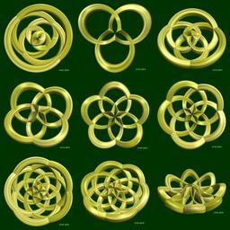 | Keywords: mathematica 3d cg parametricplot3d texture torus 輪環 りんかん ドーナツ どーなつ トーラス code program コード プログラム algorithm コード アルゴリズム geometric sculpture geometricsculpture shape geometry sculpture mapping テクスチャ マッピング 模様 もよう abstract 抽象 ちゅうしょう アブストラクト design pattern デザイン パターン graphic グラフィック グラフィクス structure 意匠 構造 symmetry 対称性 たいしょうせい シンメトリー 対称 たいしょう algorithm indoor black background a = 5; (* center hole size of a torus *) b1 = 5; (* number of cross *) b2 = 3; (* number of cross *) c = -7; (* distance from the center of rotation *) d = 5; (* number of torus *) w = 4; (* gap width *) SetOptions[ParametricPlot3D, PlotRange -> Full, Mesh -> None, Boxed -> False, Axes -> None, PlotPoints -> 400, ImageSize -> 1600, Background -> Darker[Green, 0.8], PlotStyle -> Directive[Specularity[White, 90], Texture[Import["D:/tmp/71.jpg"]]], TextureCoordinateFunction -> ({#4 + #5, #5 / Pi} &), Lighting -> "Neutral"]; f[v_] := Sin[2 Sin[Sin[Sin[v]]]]; g[v_] := Cos[2 Cos[Cos[Cos[v]]]]; x = (a - Cos[t] + w Sin[b1 s]) Cos[b2 s] + c; y = (a - Cos[t] + w Sin[b1 s]) Sin[b2 s] + c; z = w g[b1 s] + f[t] + c; rot = Table[{x, y, z}.RotationMatrix[2 i Pi/d, {1, 1, 0}], {i, d}]; ParametricPlot3D[rot, {t, 0, 2 Pi}, {s, 0, 2 Pi}] (*--- The Texture is this: www.flickr.com/photos/tanaka_juuyoh/5239255695/ *) a = 5; (* center hole size of a torus *) b1 = 5; (* number of cross *) b2 = 3; (* number of cross *) c = -7; (* distance from the center of rotation *) d = 5; (* number of torus *) w = 4; (* gap width *) SetOptions[ParametricPlot3D, PlotRange -> Full, Mesh -> None, Boxed -> False, Axes -> None, PlotPoints -> 400, ImageSize -> 1600, Background -> Darker[Green, 0.8], PlotStyle -> Directive[Specularity[White, 90], Texture[Import["D:/tmp/71.jpg"]]], TextureCoordinateFunction -> ({#4 + #5, #5 / Pi} &), Lighting -> "Neutral"]; f[v_] := Sin[2 Sin[Sin[Sin[v]]]]; g[v_] := Cos[2 Cos[Cos[Cos[v]]]]; x = (a - Cos[t] + w Sin[b1 s]) Cos[b2 s] + c; y = (a - Cos[t] + w Sin[b1 s]) Sin[b2 s] + c; z = w g[b1 s] + f[t] + c; rot = Table[{x, y, z}.RotationMatrix[2 i Pi/d, {1, 1, 0}], {i, d}]; ParametricPlot3D[rot, {t, 0, 2 Pi}, {s, 0, 2 Pi}] (*--- The Texture is this: www.flickr.com/photos/tanaka_juuyoh/5239255695/ *) |