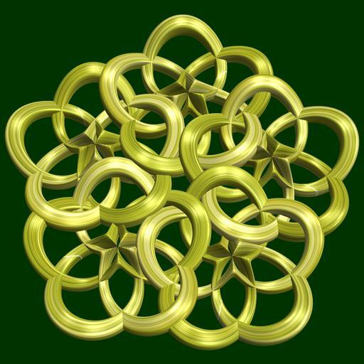 Keywords: mathematica 3d cg parametricplot3d texture torus 輪環 りんかん ドーナツ どーなつ トーラス code program コード プログラム algorithm コード アルゴリズム geometric sculpture geometricsculpture shape geometry sculpture mapping テクスチャ マッピング 模様 もよう abstract 抽象 ちゅうしょう アブストラクト design pattern デザイン パターン graphic グラフィック グラフィクス structure 意匠 構造 symmetry 対称性 たいしょうせい シンメトリー 対称 たいしょう algorithm tangle curve indoor a = 5; (* center hole size of a torus *) b1 = 5; (* number of cross *) b2 = 3; (* number of cross *) c = 7; (* distance from the center of rotation *) d = 5; (* number of torus *) w = 4; (* gap width *) SetOptions[ParametricPlot3D, PlotRange -> Full, Mesh -> None, Boxed -> False, Axes -> None, PlotPoints -> 400, ImageSize -> 3000, Background -> Darker[Green, 0.8], PlotStyle -> Directive[Specularity[White, 90], Texture[Import["D:/tmp/71.jpg"]]], TextureCoordinateFunction -> ({#4 + #5, #5 / Pi} &), Lighting -> "Neutral"]; f[v_] := Sin[2 Sin[Sin[Sin[v]]]]; g[v_] := Cos[2 Cos[Cos[Cos[v]]]]; x = (a - Cos[t] + w Sin[b1 s]) Cos[b2 s] + c; y = (a - Cos[t] + w Sin[b1 s]) Sin[b2 s] + c; z = w g[b1 s] + f[t] + c; rot = Table[{x, y, z}.RotationMatrix[2 i Pi/d, {0, 0, 1}], {i, d}]; ParametricPlot3D[rot, {t, 0, 2 Pi}, {s, 0, 2 Pi}] (*--- The Texture is this: www.flickr.com/photos/tanaka_juuyoh/5239255695/ *) a = 5; (* center hole size of a torus *) b1 = 5; (* number of cross *) b2 = 3; (* number of cross *) c = 7; (* distance from the center of rotation *) d = 5; (* number of torus *) w = 4; (* gap width *) SetOptions[ParametricPlot3D, PlotRange -> Full, Mesh -> None, Boxed -> False, Axes -> None, PlotPoints -> 400, ImageSize -> 3000, Background -> Darker[Green, 0.8], PlotStyle -> Directive[Specularity[White, 90], Texture[Import["D:/tmp/71.jpg"]]], TextureCoordinateFunction -> ({#4 + #5, #5 / Pi} &), Lighting -> "Neutral"]; f[v_] := Sin[2 Sin[Sin[Sin[v]]]]; g[v_] := Cos[2 Cos[Cos[Cos[v]]]]; x = (a - Cos[t] + w Sin[b1 s]) Cos[b2 s] + c; y = (a - Cos[t] + w Sin[b1 s]) Sin[b2 s] + c; z = w g[b1 s] + f[t] + c; rot = Table[{x, y, z}.RotationMatrix[2 i Pi/d, {0, 0, 1}], {i, d}]; ParametricPlot3D[rot, {t, 0, 2 Pi}, {s, 0, 2 Pi}] (*--- The Texture is this: www.flickr.com/photos/tanaka_juuyoh/5239255695/ *) |