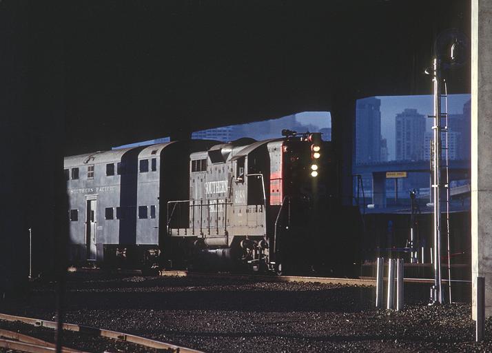 | Keywords: southern pacific southernpacific transit mass transit masstransit commuter rail commuterrail commuter train commutertrain outdoor Roger Puta took these in November 1984. SP 3188 and train under the 280 Freeway. I really like this one. The background looks like pictures of the city on a wall. Roger Puta took these in November 1984. SP 3188 and train under the 280 Freeway. I really like this one. The background looks like pictures of the city on a wall. | ||||