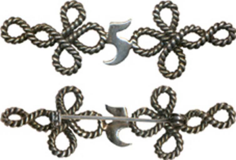 | Keywords: 5e Régiment de Hussards, broche des Epouse.s.jpg en 5th Regiment Hassard brush wives silver France fr 5 e régiment de Hassards brosse des épouses en argent France Oeuvre personnelle 2011-11-14 Fantassin 72 scanner domaine public Military insignia of French hussards 05 Frogs fasteners z brooch |