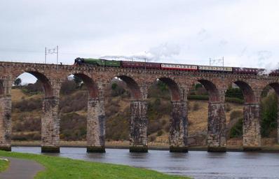 | Keywords: 60163 Tornado 7 March 2009 Berwick.jpg Brand new steam locomotive 60163 Tornado crosses the Royal Border Bridge railway viaduct in Berwick-upon-Tweed travelling south at the head of The North Briton charter train from Edinburgh to York This was the first time Tornado had passed over the viaduct in the southbound direction having crossed for the first time in northbound a week earlier hauling The Auld Reekie Express from York to Edinburgh Tornado is brand new Peppercorn A1 class locomotive completed in 2008 The Peppercorn A1 was the last type of express passenger steam locomotive that was used on this route on the East Coast Main Line from Scotland to London None of the original 49 survived the scrapyard in the change to diesel and later electric traction Tornado is coasting at this point the steam above the locomotive is actually coming from the boiler safety valves and not the chimney creating a false impression of a steam exhaust Taken at 15 12 GMT from the south bank of the River Tweed east of the bridge Tornado was approximately 15 minutes early for arrival in Berwick and proceeded to Tweedmouth sidings on the other side of the bridge to take on water own 2009-03-07 User Ultra7 LNER Peppercorn Class A1 60163 Tornado on the British mainline LNER Peppercorn Class A1 60163 Tornado in LNER Apple Green livery LNER Peppercorn Class A1 60163 Tornado in 2009 LNER Peppercorn Class A1 60163 Tornado all files LNER Peppercorn Class A1 60163 Tornado in colour photographs Royal Border Bridge Overhead lines in the United Kingdom |