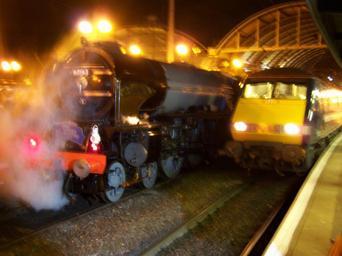 | Keywords: 60163 Tornado at Newcastle Central Station.jpg A Class 91 electric locomotive of National Express East Coast draws to a halt at Platform 2 alongside brand new steam locomotive 60163 Tornado that has recently arrived at Platform 3 in Newcastle Central Station during Tornado's third main line certification test run from York to Newcastle and back The Class 91 is the modern day successor to the Peppercorn Class A1's hauling express trains on the East Coast Main Line between London and Scotland After arriving into the station from the west over the King Edward VII Bridge she departed by reversing the train back the way she came being scheduled to lay over at Tyne Yard before returning to York later that night During this test run Tornado's tender wore the National Express logo instead of the A1 Steam Locomotive Trust's web address www a1steam com own 18 October 2008 20 57 GMT User Ultra7 LNER Peppercorn Class A1 60163 Tornado at Newcastle Central station British Rail Class 91s of National Express East Coast British Rail Class 91s in GNER debranded livery British Rail Class 91s on the East Coast Main Line Trains of National Express East Coast on the East Coast Main Line LNER Peppercorn Class A1 60163 Tornado in works undercoat LNER Peppercorn Class A1 60163 Tornado in 2008 LNER Peppercorn Class A1 60163 Tornado all files LNER Peppercorn Class A1 60163 Tornado in colour photographs |