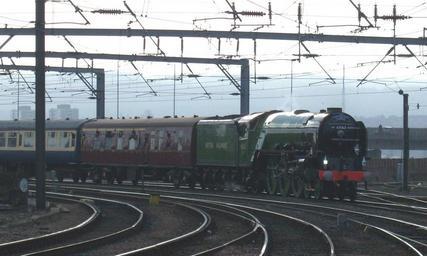 | Keywords: 60163 Tornado at Newcastle 31 Jan 09 pic 1.jpg Under the wires On her maiden passenger voyage the brand new steam locomotive no 60163 Tornado approaches Newcastle Central Station under the wires of the electrified East Coast Main Line in Newcastle upon Tyne northern England Tornado approached Newcastle just after 13 20 GMT on Saturday 31 January 2009 on her first main line passenger journey The Peppercorn Pioneer This train had started in York to the south arriving in Newcastle over the King Edward VII Bridge Tornado is approaching Platform 2 from the West with her support coach and a rake of 12 passenger carriages behind it photographed from Platform 3 After the picture was taken Tornado journeyed to Tyne Yard for servicing before returning to haul the return journey at 16 34 GMT Tornado is a 100 new locomotive completed in 2008 the first new main line steam locomotive to be built in Britain for almost 50 years She was built to the London and North Eastern Railway LNER design of the original A1 Peppercorn Class locomotives built in 1948/9 The original locomotives were also used to haul express trains on the East Coast Main Line Tornado wears the historic Apple Green livery of LNER although with 'British Railways' on the tender the first livery worn by 30 members of the original 49 strong Peppercorn A1 class The original locomotives entered service with the nationalised British Railways which absorbed the LNER and other private railway companies in 1948 The original A1 class were all scrapped by 1966 after a relatively short service life after the railway Modernisation Plan of the 1950s called for the replacement of steam with modern traction comprising both diesel and electric locomotives On her maiden voyage Tornado was carrying 500 financial supporters of the A1 Steam Locomotive Trust on The Peppercorn Pioneer named in honour of Arthur Peppercorn the chief engineer of the LNER and the original designer of the Peppercorn A1 class of locomotive The A1 Trust are a Darlington based charity who built the locomotive in a project dating back to 1990 and costing £3 million own 31 January 2009 midday User Ultra7 cropped Ultra7 60163 Tornado at Newcastle 31 Jan 09 pic 2 jpg LNER Peppercorn Class A1 60163 Tornado at Newcastle Central station LNER Peppercorn Class A1 60163 Tornado in LNER Apple Green livery LNER Peppercorn Class A1 60163 Tornado in 2009 LNER Peppercorn Class A1 60163 Tornado all files LNER Peppercorn Class A1 60163 Tornado in colour photographs 31 January Maiden voyages January 2009 in Newcastle upon Tyne |