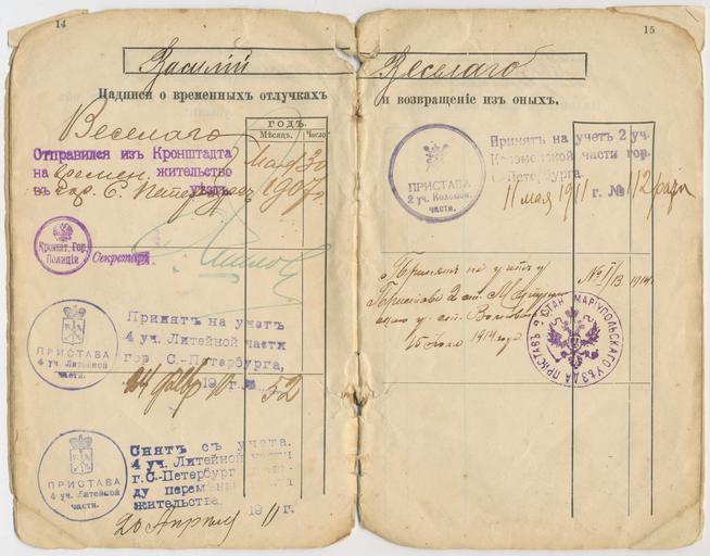 | Keywords: Ополченский билет № 6307 (1901 г.) Василия Веселаго.jpg ru Ополченский билет 6307 1901 г ст 14-15 Василий Се геевич Веселаго отметки о п инятии на воинский учёт в го одах К онштадт и Санкт-Пете бу г во 2-м стане а иупольского уезда станция Волноваха uk Ополченський білет 6307 1901 с 14-15 Василь Се гійович Веселаго У 1914 1916 оках Василь Веселаго служив у Волновасі становим п иставом 2-го стану а іупольського повіту в чині губе нського сек ета я Він закінчив фельдше ську школу в К онштадті служив на флоті в Севастополі Еміг ував в 1919 оці Як ліка б ав участь у ф анцузькому Русі Опо и 1901 Chelovechek с о игинала из собственного а хива Chelovechek from original in own archive Chelovechek de l'original en propre archive ru е указывается en Not credited PD-RusEmpire Uploaded with UploadWizard Vasily Veselago militia ticket Volnovakha |