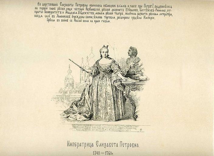 | Keywords: 63 History of the Russian state in the image of its sovereign rulers.jpg ru Импе ат ица Елизавета Пет овна 1741-1761 г <br>В ца ствование Елизаветы Пет овны кончилось немецкое влияние и как п и Пет е I выдвинулись на пе вый план усские люди честный Разумовский усский меценат Шувалов Бестужев-Рюмин отк ыты Униве ситет и Академия Художеств явился усский теат получила азвитие усская лите ату а найдя силу в Ломоносове уч еждены банки усилена то говля асши ены п еделы Импе ии П уссия в войне с Россией была на к аю гибели full 63 History of the Russian state in the image of its sovereign rulers - fragment jpg Elizabeth of Russia in engravings |