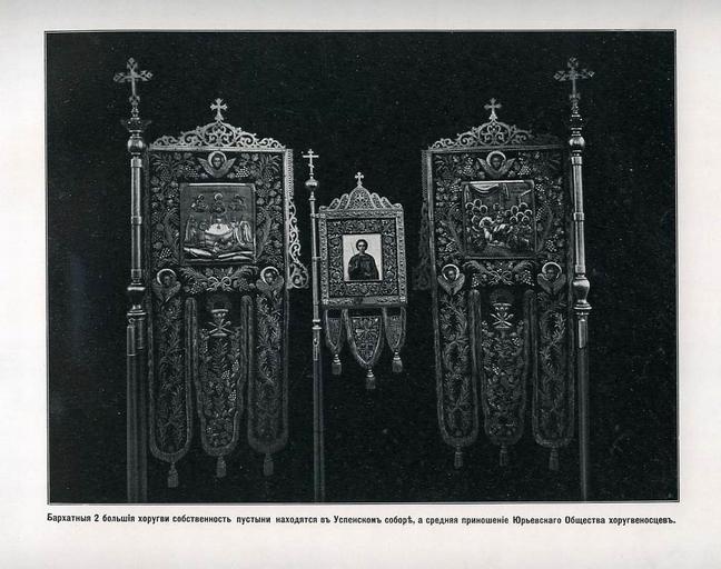 | View Original: | 66. Две большие бархатные хоругви, средняя - приношение Юрьевского общества хоругвенсцев.jpg (1012x800) | |||