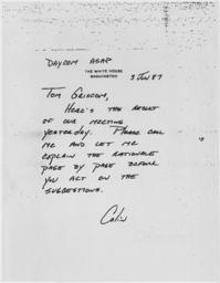 | Keywords: 6-3-1987 note from Colin Powell to Tom Griscom - NARA - 198484.tif Scope and content Handwritten note from the National Security Advisor to the Assistant to the President for Communications transmitting a draft of the June 1987 speech which Ronald Reagan gave at the Brandenberg Gate in Berlin General notes 198484 Local identifier President 1981-1989 Reagan White House Office of Records Management 01/20/1981 - 01/20/1989 Ronald Reagan Library NLRR 40 Presidential Drive Simi Valley CA 93065-0600 1987-06-03 Record group Collection RR-WHORM White House Office of Records Management File Systems White House Central Files 01/20/1981 - 01/20/1989 Record group ARC 1191 White House Office of Records Management WHORM Subject File compiled 01/20/1981 - 01/20/1989 Series ARC 198419 File unit White House Office of Records Management Subject File folder SP1107 439177 1 10/13/1986 - 10/13/1986 File unit ARC 198480 Variant control numbers NAIL Control Number NLS-WHORM-SF-SPSP1150501964 1 -SP1150 2 yes Other versions NARA-cooperation PD-USGov Colin Powell |