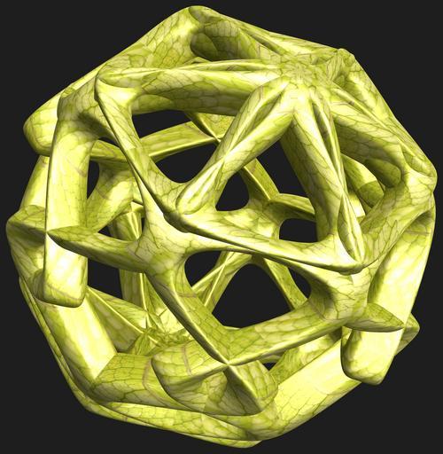 Keywords: mathematica 3d cg parametricplot3d texture torus 輪環 りんかん ドーナツ どーなつ 六芒星 ろくぼうせい 六光星 ろくこうせい 六稜星 ろくりょうせい code program algorithm コード プログラム アルゴリズム hexagram geometric sculpture geometricsculpture shape geometry sculpture mapping テクスチャ マッピング 模様 もよう abstract 抽象 ちゅうしょう アブストラクト design pattern デザイン パターン graphic グラフィック グラフィクス structure 意匠 構造 symmetry 対称性 たいしょうせい シンメトリー 対称 たいしょう algorithm コード black background indoor tangle a = 8; (* center hole size of a torus *) b = 6; (* hexa-torus *) c = -11; (* distance from the center of rotation *) d = 6; (* number of torus *) h = 3; (* height of a torus *) SetOptions[ParametricPlot3D, PlotRange -> Full, Mesh -> None, Boxed -> False, Axes -> False, PlotPoints -> 400, ImageSize -> 3000, Background -> RGBColor[{30, 30, 30}/255], PlotStyle -> Directive[Specularity[White, 30], Texture[Import["D:/tmp/71.jpg"]]], TextureCoordinateFunction -> ({#4, #5 b Pi} &), Lighting -> "Neutral"]; f[v_] := Sin[2 Sin[Sin[Sin[v]]]]; x = (a - Cos[t] - Sin[b s]) Cos[s + Pi/(2 b)]; y = (a - Cos[t] - Sin[b s]) Sin[s + Pi/(2 b)]; z = (a - f[t] - h Sin[b s]) + c; rm = Table[{x, y, z}.RotationMatrix[2 i Pi/d, {1, 0, 0}], {i, d}]; ParametricPlot3D[rm, {t, 0, 2 Pi}, {s, 0, 2 Pi}] (*--- The Texture *) a = 8; (* center hole size of a torus *) b = 6; (* hexa-torus *) c = -11; (* distance from the center of rotation *) d = 6; (* number of torus *) h = 3; (* height of a torus *) SetOptions[ParametricPlot3D, PlotRange -> Full, Mesh -> None, Boxed -> False, Axes -> False, PlotPoints -> 400, ImageSize -> 3000, Background -> RGBColor[{30, 30, 30}/255], PlotStyle -> Directive[Specularity[White, 30], Texture[Import["D:/tmp/71.jpg"]]], TextureCoordinateFunction -> ({#4, #5 b Pi} &), Lighting -> "Neutral"]; f[v_] := Sin[2 Sin[Sin[Sin[v]]]]; x = (a - Cos[t] - Sin[b s]) Cos[s + Pi/(2 b)]; y = (a - Cos[t] - Sin[b s]) Sin[s + Pi/(2 b)]; z = (a - f[t] - h Sin[b s]) + c; rm = Table[{x, y, z}.RotationMatrix[2 i Pi/d, {1, 0, 0}], {i, d}]; ParametricPlot3D[rm, {t, 0, 2 Pi}, {s, 0, 2 Pi}] (*--- The Texture *) |
