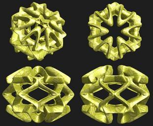 | Keywords: mathematica 3d cg parametricplot3d texture torus 輪環 りんかん ドーナツ どーなつ 六芒星 ろくぼうせい 六光星 ろくこうせい 六稜星 ろくりょうせい code program algorithm コード プログラム アルゴリズム hexagram geometric sculpture geometricsculpture shape geometry sculpture mapping テクスチャ マッピング 模様 もよう abstract 抽象 ちゅうしょう アブストラクト design pattern デザイン パターン graphic グラフィック グラフィクス structure 意匠 構造 symmetry 対称性 たいしょうせい シンメトリー 対称 たいしょう algorithm コード indoor black background foliage plant a = 5; (* center hole size of a torus *) b = 6; (* hexa-torus *) c = -10; (* distance from the center of rotation *) d = 6; (* number of torus *) h = 2; (* height of a torus *) SetOptions[ParametricPlot3D, PlotRange -> Full, Mesh -> None, Boxed -> False, Axes -> False, PlotPoints -> 400, ImageSize -> 1600, Background -> RGBColor[{30, 30, 30}/255], PlotStyle -> Directive[Specularity[White, 30], Texture[Import["D:/tmp/71.jpg"]]], TextureCoordinateFunction -> ({#4, #5 b Pi} &), Lighting -> "Neutral"]; f[v_] := Sin[2 Sin[Sin[Sin[v]]]]; x = (a - Cos[t] - Sin[b s]) Cos[s + Pi/(2 b)]; y = (a - Cos[t] - Sin[b s]) Sin[s + Pi/(2 b)]; z = (a - f[t] - h Sin[b s]) + c; rm = Table[{x, y, z}.RotationMatrix[2 i Pi/d, {1, 0, 0}], {i, d}]; ParametricPlot3D[rm, {t, 0, 2 Pi}, {s, 0, 2 Pi}] (*--- The Texture *) a = 5; (* center hole size of a torus *) b = 6; (* hexa-torus *) c = -10; (* distance from the center of rotation *) d = 6; (* number of torus *) h = 2; (* height of a torus *) SetOptions[ParametricPlot3D, PlotRange -> Full, Mesh -> None, Boxed -> False, Axes -> False, PlotPoints -> 400, ImageSize -> 1600, Background -> RGBColor[{30, 30, 30}/255], PlotStyle -> Directive[Specularity[White, 30], Texture[Import["D:/tmp/71.jpg"]]], TextureCoordinateFunction -> ({#4, #5 b Pi} &), Lighting -> "Neutral"]; f[v_] := Sin[2 Sin[Sin[Sin[v]]]]; x = (a - Cos[t] - Sin[b s]) Cos[s + Pi/(2 b)]; y = (a - Cos[t] - Sin[b s]) Sin[s + Pi/(2 b)]; z = (a - f[t] - h Sin[b s]) + c; rm = Table[{x, y, z}.RotationMatrix[2 i Pi/d, {1, 0, 0}], {i, d}]; ParametricPlot3D[rm, {t, 0, 2 Pi}, {s, 0, 2 Pi}] (*--- The Texture *) |