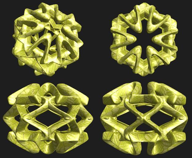 Keywords: mathematica 3d cg parametricplot3d texture torus 輪環 りんかん ドーナツ どーなつ 六芒星 ろくぼうせい 六光星 ろくこうせい 六稜星 ろくりょうせい code program algorithm コード プログラム アルゴリズム hexagram geometric sculpture geometricsculpture shape geometry sculpture mapping テクスチャ マッピング 模様 もよう abstract 抽象 ちゅうしょう アブストラクト design pattern デザイン パターン graphic グラフィック グラフィクス structure 意匠 構造 symmetry 対称性 たいしょうせい シンメトリー 対称 たいしょう algorithm コード indoor black background foliage plant a = 5; (* center hole size of a torus *) b = 6; (* hexa-torus *) c = -10; (* distance from the center of rotation *) d = 6; (* number of torus *) h = 2; (* height of a torus *) SetOptions[ParametricPlot3D, PlotRange -> Full, Mesh -> None, Boxed -> False, Axes -> False, PlotPoints -> 400, ImageSize -> 1600, Background -> RGBColor[{30, 30, 30}/255], PlotStyle -> Directive[Specularity[White, 30], Texture[Import["D:/tmp/71.jpg"]]], TextureCoordinateFunction -> ({#4, #5 b Pi} &), Lighting -> "Neutral"]; f[v_] := Sin[2 Sin[Sin[Sin[v]]]]; x = (a - Cos[t] - Sin[b s]) Cos[s + Pi/(2 b)]; y = (a - Cos[t] - Sin[b s]) Sin[s + Pi/(2 b)]; z = (a - f[t] - h Sin[b s]) + c; rm = Table[{x, y, z}.RotationMatrix[2 i Pi/d, {1, 0, 0}], {i, d}]; ParametricPlot3D[rm, {t, 0, 2 Pi}, {s, 0, 2 Pi}] (*--- The Texture *) a = 5; (* center hole size of a torus *) b = 6; (* hexa-torus *) c = -10; (* distance from the center of rotation *) d = 6; (* number of torus *) h = 2; (* height of a torus *) SetOptions[ParametricPlot3D, PlotRange -> Full, Mesh -> None, Boxed -> False, Axes -> False, PlotPoints -> 400, ImageSize -> 1600, Background -> RGBColor[{30, 30, 30}/255], PlotStyle -> Directive[Specularity[White, 30], Texture[Import["D:/tmp/71.jpg"]]], TextureCoordinateFunction -> ({#4, #5 b Pi} &), Lighting -> "Neutral"]; f[v_] := Sin[2 Sin[Sin[Sin[v]]]]; x = (a - Cos[t] - Sin[b s]) Cos[s + Pi/(2 b)]; y = (a - Cos[t] - Sin[b s]) Sin[s + Pi/(2 b)]; z = (a - f[t] - h Sin[b s]) + c; rm = Table[{x, y, z}.RotationMatrix[2 i Pi/d, {1, 0, 0}], {i, d}]; ParametricPlot3D[rm, {t, 0, 2 Pi}, {s, 0, 2 Pi}] (*--- The Texture *) |