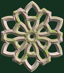 | Keywords: mathematica 3d cg parametricplot3d texture torus code program algorithm プログラム コード アルゴリズム 輪環 りんかん ドーナツ どーなつ 六芒星 ろくぼうせい geometric sculpture geometricsculpture shape geometry sculpture mapping テクスチャ マッピング 模様 もよう abstract 抽象 ちゅうしょう アブストラクト design pattern デザイン パターン graphic グラフィック グラフィクス structure 意匠 構造 symmetry 対称性 たいしょうせい シンメトリー 対称 たいしょう tangle wheel indoor black background a = 5; (* center hole size *) b = 6; (* hexa-torus *) c = 3; (* distance from the center of rotation *) d = 6; (* number of torus *) h = 0; (* height of a torus *) SetOptions[ParametricPlot3D, PlotRange -> Full, Mesh -> None, Boxed -> False, Axes -> False, PlotPoints -> 400, ImageSize -> 3000, Background -> RGBColor[{20, 50, 30}/255], PlotStyle -> Directive[Specularity[White, 40], Texture[Import["D:/tmp/862.jpg"]]], TextureCoordinateFunction -> ({#4 + #5, #5 / Pi} &), Lighting -> "Neutral"]; f[v_] := TriangleWave[{-1, 1}, v/(2 Pi)]; g[v_] := TriangleWave[{-1, 1}, v/(2 Pi) + 1/4]; x = (a - g[t] - f[b s]) Cos[s] + c; y = (a - g[t] - f[b s]) Sin[s] + c; z = (a - f[t] - h f[b s]); rm = Table[{x, y, z}.RotationMatrix[2 i Pi/d, {0, 0, 1}], {i, d}]; ParametricPlot3D[rm, {t, 0, 2 Pi}, {s, 0, Pi}] (*--- The Texture *) a = 5; (* center hole size *) b = 6; (* hexa-torus *) c = 3; (* distance from the center of rotation *) d = 6; (* number of torus *) h = 0; (* height of a torus *) SetOptions[ParametricPlot3D, PlotRange -> Full, Mesh -> None, Boxed -> False, Axes -> False, PlotPoints -> 400, ImageSize -> 3000, Background -> RGBColor[{20, 50, 30}/255], PlotStyle -> Directive[Specularity[White, 40], Texture[Import["D:/tmp/862.jpg"]]], TextureCoordinateFunction -> ({#4 + #5, #5 / Pi} &), Lighting -> "Neutral"]; f[v_] := TriangleWave[{-1, 1}, v/(2 Pi)]; g[v_] := TriangleWave[{-1, 1}, v/(2 Pi) + 1/4]; x = (a - g[t] - f[b s]) Cos[s] + c; y = (a - g[t] - f[b s]) Sin[s] + c; z = (a - f[t] - h f[b s]); rm = Table[{x, y, z}.RotationMatrix[2 i Pi/d, {0, 0, 1}], {i, d}]; ParametricPlot3D[rm, {t, 0, 2 Pi}, {s, 0, Pi}] (*--- The Texture *) |