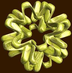 | Keywords: mathematica 3d cg parametricplot3d texture torus 輪環 りんかん ドーナツ どーなつ 六芒星 ろくぼうせい 六光星 ろくこうせい 六稜星 ろくりょうせい code program algorithm コード プログラム アルゴリズム hexagram geometric sculpture geometricsculpture shape geometry sculpture mapping テクスチャ マッピング 模様 もよう abstract 抽象 ちゅうしょう アブストラクト design pattern デザイン パターン graphic グラフィック グラフィクス structure 意匠 構造 symmetry 対称性 たいしょうせい シンメトリー 対称 たいしょう algorithm コード black background indoor organic pattern blossom plant a = 6; (* center hole size of a torus *) b = 6; (* hexa-torus *) c = 2; (* distance from the center of rotation *) d = 6; (* number of torus *) h = 2; (* height of a torus *) SetOptions[ParametricPlot3D, PlotRange -> Full, Mesh -> None, Boxed -> False, Axes -> False, PlotPoints -> 400, ImageSize -> 3000, Background -> Darker[Orange, 0.8], PlotStyle -> Directive[Specularity[White, 30], Texture[Import["D:/tmp/71.jpg"]]], TextureCoordinateFunction -> ({#4 , #5 2 Pi} &), Lighting -> "Neutral"]; f[v_] := Sin[2 Sin[Sin[Sin[v]]]]; x = (a - Cos[t] - f[b s]) Cos[s] + c; y = (a - Cos[t] - f[b s]) Sin[s] + c; z = (a - Sin[t] - h f[b s]); rot = Table[{x, y, z}.RotationMatrix[2 i Pi/d, {1, 1, 0}], {i, d}]; ParametricPlot3D[rot, {t, 0, 2 Pi}, {s, 0, 2 Pi}] (*--- The Texture is this: www.flickr.com/photos/tanaka_juuyoh/5239255695/ *) a = 6; (* center hole size of a torus *) b = 6; (* hexa-torus *) c = 2; (* distance from the center of rotation *) d = 6; (* number of torus *) h = 2; (* height of a torus *) SetOptions[ParametricPlot3D, PlotRange -> Full, Mesh -> None, Boxed -> False, Axes -> False, PlotPoints -> 400, ImageSize -> 3000, Background -> Darker[Orange, 0.8], PlotStyle -> Directive[Specularity[White, 30], Texture[Import["D:/tmp/71.jpg"]]], TextureCoordinateFunction -> ({#4 , #5 2 Pi} &), Lighting -> "Neutral"]; f[v_] := Sin[2 Sin[Sin[Sin[v]]]]; x = (a - Cos[t] - f[b s]) Cos[s] + c; y = (a - Cos[t] - f[b s]) Sin[s] + c; z = (a - Sin[t] - h f[b s]); rot = Table[{x, y, z}.RotationMatrix[2 i Pi/d, {1, 1, 0}], {i, d}]; ParametricPlot3D[rot, {t, 0, 2 Pi}, {s, 0, 2 Pi}] (*--- The Texture is this: www.flickr.com/photos/tanaka_juuyoh/5239255695/ *) |