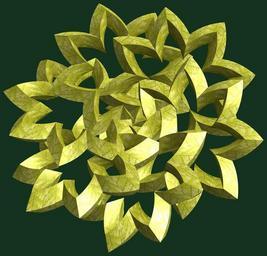 | Keywords: mathematica 3d cg parametricplot3d texture torus code program algorithm プログラム コード アルゴリズム 輪環 りんかん ドーナツ どーなつ 八芒星 はちぼうせい geometric sculpture geometricsculpture shape geometry sculpture mapping テクスチャ マッピング 模様 もよう abstract 抽象 ちゅうしょう アブストラクト design pattern デザイン パターン graphic グラフィック グラフィクス structure 意匠 構造 symmetry 対称性 たいしょうせい シンメトリー 対称 たいしょう organic pattern plant foliage tree black background leaf outdoor a = 4; (* center hole size *) b = 8; (* octa-torus *) c = 4; (* distance from the center of rotation *) d = 6; (* number of torus *) h = 0; (* height of a torus *) SetOptions[ParametricPlot3D, PlotRange -> Full, Mesh -> None, Boxed -> False, Axes -> False, PlotPoints -> 400, ImageSize -> 3000, Background -> RGBColor[{20, 50, 30}/255], PlotStyle -> Directive[Specularity[White, 30], Texture[Import["D:/tmp/71.jpg"]]], TextureCoordinateFunction -> ({#4, #5 Pi} &), Lighting -> "Neutral"]; f[v_] := TriangleWave[{-1, 1}, v/(2 Pi)]; g[v_] := TriangleWave[{-1, 1}, v/(2 Pi) + 1/4]; x = (a - g[t] - f[b s]) Cos[s] + c; y = (a - g[t] - f[b s]) Sin[s] + c; z = (a - f[t] - h f[b s]); rm = Table[{x, y, z}.RotationMatrix[2 i Pi/d, {0, 1, 2}], {i, d}]; ParametricPlot3D[rm, {t, 0, 2 Pi}, {s, 0, Pi}] (*--- The Texture *) a = 4; (* center hole size *) b = 8; (* octa-torus *) c = 4; (* distance from the center of rotation *) d = 6; (* number of torus *) h = 0; (* height of a torus *) SetOptions[ParametricPlot3D, PlotRange -> Full, Mesh -> None, Boxed -> False, Axes -> False, PlotPoints -> 400, ImageSize -> 3000, Background -> RGBColor[{20, 50, 30}/255], PlotStyle -> Directive[Specularity[White, 30], Texture[Import["D:/tmp/71.jpg"]]], TextureCoordinateFunction -> ({#4, #5 Pi} &), Lighting -> "Neutral"]; f[v_] := TriangleWave[{-1, 1}, v/(2 Pi)]; g[v_] := TriangleWave[{-1, 1}, v/(2 Pi) + 1/4]; x = (a - g[t] - f[b s]) Cos[s] + c; y = (a - g[t] - f[b s]) Sin[s] + c; z = (a - f[t] - h f[b s]); rm = Table[{x, y, z}.RotationMatrix[2 i Pi/d, {0, 1, 2}], {i, d}]; ParametricPlot3D[rm, {t, 0, 2 Pi}, {s, 0, Pi}] (*--- The Texture *) |