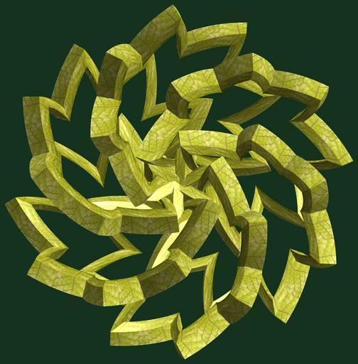 Keywords: mathematica 3d cg parametricplot3d texture torus code program algorithm プログラム コード アルゴリズム 輪環 りんかん ドーナツ どーなつ 八芒星 はちぼうせい geometric sculpture geometricsculpture shape geometry sculpture mapping テクスチャ マッピング 模様 もよう abstract 抽象 ちゅうしょう アブストラクト design pattern デザイン パターン graphic グラフィック グラフィクス structure 意匠 構造 symmetry 対称性 たいしょうせい シンメトリー 対称 たいしょう organic pattern outdoor a = 6; (* center hole size *) b = 8; (* octa-torus *) c = 5; (* distance from the center of rotation *) d = 6; (* number of torus *) h = 2; (* height of a torus *) SetOptions[ParametricPlot3D, PlotRange -> Full, Mesh -> None, Boxed -> False, Axes -> False, PlotPoints -> 400, ImageSize -> 3000, Background -> RGBColor[{20, 50, 30}/255], PlotStyle -> Directive[Specularity[White, 30], Texture[Import["D:/tmp/71.jpg"]]], TextureCoordinateFunction -> ({#4, #5 Pi} &), Lighting -> "Neutral"]; f[v_] := TriangleWave[{-1, 1}, v/(2 Pi)]; g[v_] := TriangleWave[{-1, 1}, v/(2 Pi) + 1/4]; x = (a - g[t] - f[b s]) Cos[s] + c; y = (a - g[t] - f[b s]) Sin[s] + c; z = (a - f[t] - h f[b s]); rm = Table[{x, y, z}.RotationMatrix[2 i Pi/d, {0, 1, 2}], {i, d}]; ParametricPlot3D[rm, {t, 0, 2 Pi}, {s, 0, Pi}] (*--- The Texture *) a = 6; (* center hole size *) b = 8; (* octa-torus *) c = 5; (* distance from the center of rotation *) d = 6; (* number of torus *) h = 2; (* height of a torus *) SetOptions[ParametricPlot3D, PlotRange -> Full, Mesh -> None, Boxed -> False, Axes -> False, PlotPoints -> 400, ImageSize -> 3000, Background -> RGBColor[{20, 50, 30}/255], PlotStyle -> Directive[Specularity[White, 30], Texture[Import["D:/tmp/71.jpg"]]], TextureCoordinateFunction -> ({#4, #5 Pi} &), Lighting -> "Neutral"]; f[v_] := TriangleWave[{-1, 1}, v/(2 Pi)]; g[v_] := TriangleWave[{-1, 1}, v/(2 Pi) + 1/4]; x = (a - g[t] - f[b s]) Cos[s] + c; y = (a - g[t] - f[b s]) Sin[s] + c; z = (a - f[t] - h f[b s]); rm = Table[{x, y, z}.RotationMatrix[2 i Pi/d, {0, 1, 2}], {i, d}]; ParametricPlot3D[rm, {t, 0, 2 Pi}, {s, 0, Pi}] (*--- The Texture *) |