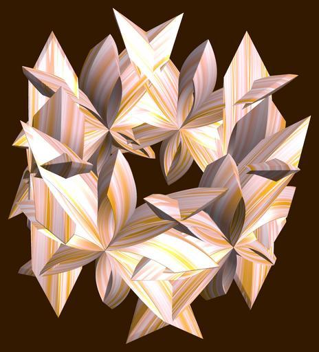 Keywords: mathematica 3d cg parametricplot3d texture torus trianglewave 輪環 りんかん ドーナツ どーなつ 八芒星 はちぼうせい 八光星 はちこうせい 八稜星 はちりょうせい program プログラム code コード algorithm コード アルゴリズム geometric sculpture geometricsculpture shape geometry sculpture mapping テクスチャ マッピング 模様 もよう design pattern デザイン パターン graphic グラフィック グラフィクス structure 意匠 構造 symmetry 対称性 たいしょうせい シンメトリー 対称 たいしょう algorithm black background photo border SetOptions[ParametricPlot3D, PlotRange -> Full, Mesh -> None, Boxed -> False, Axes -> None, PlotPoints -> 400, ImageSize -> 3000, Background -> Darker[Orange, 0.8], PlotStyle -> Directive[Specularity[White, 30], Texture[Import["D:/tmp/861.jpg"]]], TextureCoordinateFunction -> ({#4 + #5, #5/Pi} &), Lighting -> "Neutral"]; a = 2; (* center hole size of a torus *) b = 8; (* octa-torus *) c = 8; (* distance from the center of rotation *) d = 6; (* number of torus *) f[v_] := 2 TriangleWave[{-1, 1}, v] ; g[v_] := 2 TriangleWave[{-1, 1}, v + 1/4] ; x = (a - f[t] - g[b s]) f[s + Pi/(2 b)] + c; y = g[t] + c; z = (a - f[t] - g[b s]) g[s + Pi/(2 b)] + c; rot = Table[{x, y, z}.RotationMatrix[2 i Pi /d, {1, 0, 1}], {i, d}]; ParametricPlot3D[rot, {t, 0, 1}, {s, 0, 1}] (* --- The Texture is another color version of this: www.flickr.com/photos/tanaka_juuyoh/5412528282 *) SetOptions[ParametricPlot3D, PlotRange -> Full, Mesh -> None, Boxed -> False, Axes -> None, PlotPoints -> 400, ImageSize -> 3000, Background -> Darker[Orange, 0.8], PlotStyle -> Directive[Specularity[White, 30], Texture[Import["D:/tmp/861.jpg"]]], TextureCoordinateFunction -> ({#4 + #5, #5/Pi} &), Lighting -> "Neutral"]; a = 2; (* center hole size of a torus *) b = 8; (* octa-torus *) c = 8; (* distance from the center of rotation *) d = 6; (* number of torus *) f[v_] := 2 TriangleWave[{-1, 1}, v] ; g[v_] := 2 TriangleWave[{-1, 1}, v + 1/4] ; x = (a - f[t] - g[b s]) f[s + Pi/(2 b)] + c; y = g[t] + c; z = (a - f[t] - g[b s]) g[s + Pi/(2 b)] + c; rot = Table[{x, y, z}.RotationMatrix[2 i Pi /d, {1, 0, 1}], {i, d}]; ParametricPlot3D[rot, {t, 0, 1}, {s, 0, 1}] (* --- The Texture is another color version of this: www.flickr.com/photos/tanaka_juuyoh/5412528282 *) |