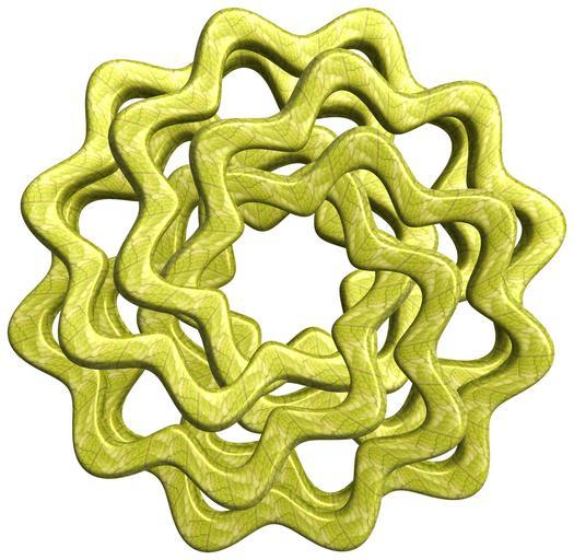 Keywords: mathematica 3d cg parametricplot3d texture torus 輪環 りんかん ドーナツ どーなつ 八芒星 はちぼうせい 八光星 はちこうせい 八稜星 はちりょうせい program プログラム code コード algorithm コード アルゴリズム geometric sculpture geometricsculpture shape geometry sculpture mapping テクスチャ マッピング 模様 もよう abstract 抽象 ちゅうしょう アブストラクト design pattern デザイン パターン graphic グラフィック グラフィクス structure 意匠 構造 symmetry 対称性 たいしょうせい シンメトリー 対称 たいしょう algorithm white background indoor a = 8; (* center hole size of a torus *) b = 8; (* octa-torus *) c = 3; (* distance from the center of rotation *) d = 6; (* number of torus *) SetOptions[ParametricPlot3D, PlotRange -> Full, Mesh -> None, Boxed -> False, Axes -> None, PlotPoints -> 400, ImageSize -> 3000, PlotStyle -> Directive[Specularity[White, 50], Texture[Import["D:/tmp/71.jpg"]]], TextureCoordinateFunction -> ({#4, #5 b Pi} &), Lighting -> "Neutral"]; x = (a - Cos[t] - Sin[b s]) Cos[s + Pi/(2 b)] + c; y = Sin[2 Sin[Sin[Sin[t]]]] + c; z = (a - Cos[t] - Sin[b s]) Sin[s + Pi/(2 b)] + c; rot = Table[{x, y, z}.RotationMatrix[2 i Pi/d, {1, 5, 0}], {i, d}]; ParametricPlot3D[rot, {t, 0, 2 Pi}, {s, 0, 2 Pi}] (*--- The Texture *) a = 8; (* center hole size of a torus *) b = 8; (* octa-torus *) c = 3; (* distance from the center of rotation *) d = 6; (* number of torus *) SetOptions[ParametricPlot3D, PlotRange -> Full, Mesh -> None, Boxed -> False, Axes -> None, PlotPoints -> 400, ImageSize -> 3000, PlotStyle -> Directive[Specularity[White, 50], Texture[Import["D:/tmp/71.jpg"]]], TextureCoordinateFunction -> ({#4, #5 b Pi} &), Lighting -> "Neutral"]; x = (a - Cos[t] - Sin[b s]) Cos[s + Pi/(2 b)] + c; y = Sin[2 Sin[Sin[Sin[t]]]] + c; z = (a - Cos[t] - Sin[b s]) Sin[s + Pi/(2 b)] + c; rot = Table[{x, y, z}.RotationMatrix[2 i Pi/d, {1, 5, 0}], {i, d}]; ParametricPlot3D[rot, {t, 0, 2 Pi}, {s, 0, 2 Pi}] (*--- The Texture *) |