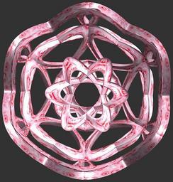 | Keywords: mathematica 3d cg parametricplot3d texture torus 輪環 りんかん ドーナツ どーなつ 五芒星 ごぼうせい 五光星 ごこうせい 五稜星 ごりょうせい code program algorithm コード プログラム アルゴリズム pentagram geometric sculpture geometricsculpture shape geometry sculpture mapping テクスチャ マッピング 模様 もよう abstract 抽象 ちゅうしょう アブストラクト design pattern デザイン パターン graphic グラフィック グラフィクス structure 意匠 構造 symmetry 対称性 たいしょうせい シンメトリー 対称 たいしょう algorithm コード wheel tangle black background round tire rim circle a = 3; (* center hole size of a torus *) b = 5; (* penta-torus *) c = 3; (* distance from the center of rotation *) d = 6; (* number of torus *) h = 1.5; (* height of a torus *) SetOptions[ParametricPlot3D, PlotRange -> Full, Mesh -> None, Boxed -> False, Axes -> False, PlotPoints -> 400, ImageSize -> 3000, Background -> RGBColor[{50, 50, 50}/255], PlotStyle -> Directive[Specularity[White, 30], Texture[Import["D:/tmp/86.jpg"]]], TextureCoordinateFunction -> ({#4, #5 2 Pi} &), Lighting -> "Neutral"]; f[v_] := Cos[2 Cos[Cos[Cos[v]]]]; x = (a - f[t] - Sin[b s]) Cos[s + 3 Pi/(4 b)] + c; y = (a - f[t] - Sin[b s]) Sin[s + 3 Pi/(4 b)] + c; z = (a - Sin[t/2] - h Sin[b s]); rot = Table[{x, y, z}.RotationMatrix[2 i Pi/d, {1, 1, 2}], {i, d}]; ParametricPlot3D[rot, {t, 0, 2 Pi}, {s, 0, 2 Pi}] (*--- The Texture *) a = 3; (* center hole size of a torus *) b = 5; (* penta-torus *) c = 3; (* distance from the center of rotation *) d = 6; (* number of torus *) h = 1.5; (* height of a torus *) SetOptions[ParametricPlot3D, PlotRange -> Full, Mesh -> None, Boxed -> False, Axes -> False, PlotPoints -> 400, ImageSize -> 3000, Background -> RGBColor[{50, 50, 50}/255], PlotStyle -> Directive[Specularity[White, 30], Texture[Import["D:/tmp/86.jpg"]]], TextureCoordinateFunction -> ({#4, #5 2 Pi} &), Lighting -> "Neutral"]; f[v_] := Cos[2 Cos[Cos[Cos[v]]]]; x = (a - f[t] - Sin[b s]) Cos[s + 3 Pi/(4 b)] + c; y = (a - f[t] - Sin[b s]) Sin[s + 3 Pi/(4 b)] + c; z = (a - Sin[t/2] - h Sin[b s]); rot = Table[{x, y, z}.RotationMatrix[2 i Pi/d, {1, 1, 2}], {i, d}]; ParametricPlot3D[rot, {t, 0, 2 Pi}, {s, 0, 2 Pi}] (*--- The Texture *) |