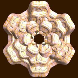 | Keywords: mathematica 3d cg parametricplot3d texture torus 輪環 りんかん ドーナツ どーなつ 五芒星 ごぼうせい 五光星 ごこうせい 五稜星 ごりょうせい code program algorithm コード プログラム アルゴリズム pentagram geometric sculpture geometricsculpture shape geometry sculpture mapping テクスチャ マッピング 模様 もよう abstract 抽象 ちゅうしょう アブストラクト design pattern デザイン パターン graphic グラフィック グラフィクス structure 意匠 構造 symmetry 対称性 たいしょうせい シンメトリー 対称 たいしょう algorithm コード indoor black background a = 6; (* center hole size of a torus *) b = 5; (* penta-torus *) c = 2; (* distance from the center of rotation *) d = 6; (* number of torus *) h = 1; (* height of a torus *) SetOptions[ParametricPlot3D, PlotRange -> Full, Mesh -> None, Boxed -> False, Axes -> False, PlotPoints -> 400, ImageSize -> 3000, Background -> Darker[Orange, 0.8], PlotStyle -> Directive[Specularity[White, 30], Texture[Import["D:/tmp/861.jpg"]]], TextureCoordinateFunction -> ({#4, #5 2 Pi} &), Lighting -> "Neutral"]; f[v_] := Sin[2 Sin[Sin[Sin[v]]]]; g[v_] := Sum[Cos[(2 k - 1) v]/(2 k - 1), {k, 4}]; x = (a - g[t] - f[b s]) Cos[s + 3 Pi/(4 b)] + c; y = (a - g[t] - f[b s]) Sin[s + 3 Pi/(4 b)] + c; z = (a - Sin[t] - h f[b s]); rot = Table[{x, y, z}.RotationMatrix[2 i Pi/d, {0, 0, 1}], {i, d}]; ParametricPlot3D[rot, {t, 0, 2 Pi}, {s, 0, 2 Pi}] (*--- The Texture *) a = 6; (* center hole size of a torus *) b = 5; (* penta-torus *) c = 2; (* distance from the center of rotation *) d = 6; (* number of torus *) h = 1; (* height of a torus *) SetOptions[ParametricPlot3D, PlotRange -> Full, Mesh -> None, Boxed -> False, Axes -> False, PlotPoints -> 400, ImageSize -> 3000, Background -> Darker[Orange, 0.8], PlotStyle -> Directive[Specularity[White, 30], Texture[Import["D:/tmp/861.jpg"]]], TextureCoordinateFunction -> ({#4, #5 2 Pi} &), Lighting -> "Neutral"]; f[v_] := Sin[2 Sin[Sin[Sin[v]]]]; g[v_] := Sum[Cos[(2 k - 1) v]/(2 k - 1), {k, 4}]; x = (a - g[t] - f[b s]) Cos[s + 3 Pi/(4 b)] + c; y = (a - g[t] - f[b s]) Sin[s + 3 Pi/(4 b)] + c; z = (a - Sin[t] - h f[b s]); rot = Table[{x, y, z}.RotationMatrix[2 i Pi/d, {0, 0, 1}], {i, d}]; ParametricPlot3D[rot, {t, 0, 2 Pi}, {s, 0, 2 Pi}] (*--- The Texture *) |