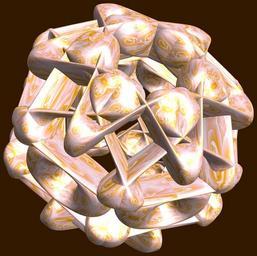 | Keywords: mathematica 3d cg parametricplot3d texture torus 輪環 りんかん ドーナツ どーなつ 六芒星 ろくぼうせい 六光星 ろくこうせい 六稜星 ろくりょうせい code program algorithm コード プログラム アルゴリズム hexagram geometric sculpture geometricsculpture shape geometry sculpture mapping テクスチャ マッピング 模様 もよう abstract 抽象 ちゅうしょう アブストラクト design pattern デザイン パターン graphic グラフィック グラフィクス structure 意匠 構造 symmetry 対称性 たいしょうせい シンメトリー 対称 たいしょう algorithm コード black background indoor food a = 4; (* center hole size of a torus *) b = 6; (* hexa-torus *) c = -7; (* distance from the center of rotation *) d = 6; (* number of torus *) h = 2; (* height of a torus *) SetOptions[ParametricPlot3D, PlotRange -> Full, Mesh -> None, Boxed -> False, Axes -> False, PlotPoints -> 400, ImageSize -> 3000, Background -> Darker[Orange, 0.8], PlotStyle -> Directive[Specularity[White, 30], Texture[Import["D:/tmp/861.jpg"]]], TextureCoordinateFunction -> ({#4, #5 2 Pi} &), Lighting -> "Neutral"]; f[v_] := Sin[2 Sin[Sin[Sin[v]]]]; x = (a - Cos[t] - f[b s]) Cos[s + Pi/b]; y = (a - Cos[t] - f[b s]) Sin[s + Pi/b]; z = (a - Sin[t] - h f[b s]) + c; rm = Table[{x, y, z}.RotationMatrix[2 i Pi/d, {1, 1, 0}], {i, d}]; ParametricPlot3D[rm, {t, 0, 2 Pi}, {s, 0, 2 Pi}] (*--- The Texture *) a = 4; (* center hole size of a torus *) b = 6; (* hexa-torus *) c = -7; (* distance from the center of rotation *) d = 6; (* number of torus *) h = 2; (* height of a torus *) SetOptions[ParametricPlot3D, PlotRange -> Full, Mesh -> None, Boxed -> False, Axes -> False, PlotPoints -> 400, ImageSize -> 3000, Background -> Darker[Orange, 0.8], PlotStyle -> Directive[Specularity[White, 30], Texture[Import["D:/tmp/861.jpg"]]], TextureCoordinateFunction -> ({#4, #5 2 Pi} &), Lighting -> "Neutral"]; f[v_] := Sin[2 Sin[Sin[Sin[v]]]]; x = (a - Cos[t] - f[b s]) Cos[s + Pi/b]; y = (a - Cos[t] - f[b s]) Sin[s + Pi/b]; z = (a - Sin[t] - h f[b s]) + c; rm = Table[{x, y, z}.RotationMatrix[2 i Pi/d, {1, 1, 0}], {i, d}]; ParametricPlot3D[rm, {t, 0, 2 Pi}, {s, 0, 2 Pi}] (*--- The Texture *) |