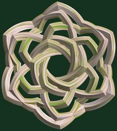 | Keywords: mathematica 3d cg parametricplot3d texture torus code program algorithm プログラム コード アルゴリズム 輪環 りんかん ドーナツ どーなつ 四芒星 しぼうせい geometric sculpture geometricsculpture shape geometry sculpture mapping テクスチャ マッピング 模様 もよう abstract 抽象 ちゅうしょう アブストラクト design pattern デザイン パターン graphic グラフィック グラフィクス structure 意匠 構造 symmetry 対称性 たいしょうせい シンメトリー 対称 たいしょう tangle a = 8; (* center hole size *) b = 4; (* tetra-torus *) c = 6; (* distance from the center of rotation *) d = 6; (* number of torus *) h = 2; (* height of a torus *) SetOptions[ParametricPlot3D, PlotRange -> Full, Mesh -> None, Boxed -> False, Axes -> False, PlotPoints -> 400, ImageSize -> 3000, Background -> RGBColor[{20, 50, 30}/255], PlotStyle -> Directive[Specularity[White, 70], Texture[Import["D:/tmp/862.jpg"]]], TextureCoordinateFunction -> ({#4 + #5, #5 / Pi} &), Lighting -> "Neutral"]; f[v_] := TriangleWave[{-1, 1}, v/(2 Pi)]; g[v_] := TriangleWave[{-1, 1}, v/(2 Pi) + 1/4]; x = (a - g[t] - f[b s]) Cos[s] + c; y = (a - g[t] - f[b s]) Sin[s] + c; z = (a - f[t] - h f[b s]); rm = Table[{x, y, z}.RotationMatrix[2 i Pi/d, {0, 0, 1}], {i, d}]; ParametricPlot3D[rm, {t, 0, 2 Pi}, {s, 0, Pi}] (*--- The Texture *) a = 8; (* center hole size *) b = 4; (* tetra-torus *) c = 6; (* distance from the center of rotation *) d = 6; (* number of torus *) h = 2; (* height of a torus *) SetOptions[ParametricPlot3D, PlotRange -> Full, Mesh -> None, Boxed -> False, Axes -> False, PlotPoints -> 400, ImageSize -> 3000, Background -> RGBColor[{20, 50, 30}/255], PlotStyle -> Directive[Specularity[White, 70], Texture[Import["D:/tmp/862.jpg"]]], TextureCoordinateFunction -> ({#4 + #5, #5 / Pi} &), Lighting -> "Neutral"]; f[v_] := TriangleWave[{-1, 1}, v/(2 Pi)]; g[v_] := TriangleWave[{-1, 1}, v/(2 Pi) + 1/4]; x = (a - g[t] - f[b s]) Cos[s] + c; y = (a - g[t] - f[b s]) Sin[s] + c; z = (a - f[t] - h f[b s]); rm = Table[{x, y, z}.RotationMatrix[2 i Pi/d, {0, 0, 1}], {i, d}]; ParametricPlot3D[rm, {t, 0, 2 Pi}, {s, 0, Pi}] (*--- The Texture *) |