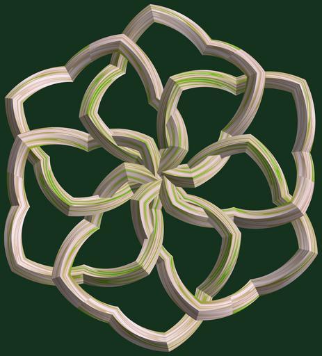 Keywords: mathematica 3d cg parametricplot3d texture torus code program algorithm プログラム コード アルゴリズム 輪環 りんかん ドーナツ どーなつ 四芒星 しぼうせい geometric sculpture geometricsculpture shape geometry sculpture mapping テクスチャ マッピング 模様 もよう abstract 抽象 ちゅうしょう アブストラクト design pattern デザイン パターン graphic グラフィック グラフィクス structure 意匠 構造 symmetry 対称性 たいしょうせい シンメトリー 対称 たいしょう tangle black background a = 8; (* center hole size *) b = 4; (* tetra-torus *) c = 6; (* distance from the center of rotation *) d = 6; (* number of torus *) h = 2; (* height of a torus *) SetOptions[ParametricPlot3D, PlotRange -> Full, Mesh -> None, Boxed -> False, Axes -> False, PlotPoints -> 400, ImageSize -> 3000, Background -> RGBColor[{20, 50, 30}/255], PlotStyle -> Directive[Specularity[White, 70], Texture[Import["D:/tmp/862.jpg"]]], TextureCoordinateFunction -> ({#4 + #5, #5 / Pi} &), Lighting -> "Neutral"]; f[v_] := TriangleWave[{-1, 1}, v/(2 Pi)]; g[v_] := TriangleWave[{-1, 1}, v/(2 Pi) + 1/4]; x = (a - g[t] - f[b s]) Cos[s] + c; y = (a - g[t] - f[b s]) Sin[s] + c; z = (a - f[t] - h f[b s]); rm = Table[{x, y, z}.RotationMatrix[2 i Pi/d, {0, 0, 1}], {i, d}]; ParametricPlot3D[rm, {t, 0, 2 Pi}, {s, 0, Pi}] (*--- The Texture *) a = 8; (* center hole size *) b = 4; (* tetra-torus *) c = 6; (* distance from the center of rotation *) d = 6; (* number of torus *) h = 2; (* height of a torus *) SetOptions[ParametricPlot3D, PlotRange -> Full, Mesh -> None, Boxed -> False, Axes -> False, PlotPoints -> 400, ImageSize -> 3000, Background -> RGBColor[{20, 50, 30}/255], PlotStyle -> Directive[Specularity[White, 70], Texture[Import["D:/tmp/862.jpg"]]], TextureCoordinateFunction -> ({#4 + #5, #5 / Pi} &), Lighting -> "Neutral"]; f[v_] := TriangleWave[{-1, 1}, v/(2 Pi)]; g[v_] := TriangleWave[{-1, 1}, v/(2 Pi) + 1/4]; x = (a - g[t] - f[b s]) Cos[s] + c; y = (a - g[t] - f[b s]) Sin[s] + c; z = (a - f[t] - h f[b s]); rm = Table[{x, y, z}.RotationMatrix[2 i Pi/d, {0, 0, 1}], {i, d}]; ParametricPlot3D[rm, {t, 0, 2 Pi}, {s, 0, Pi}] (*--- The Texture *) |