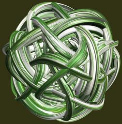 | Keywords: mathematica 3d cg parametricplot3d texture torus code program algorithm プログラム コード アルゴリズム 輪環 りんかん ドーナツ どーなつ トーラス とーらす knot 結び目 むすびめ mapping テクスチャ マッピング 模様 もよう design pattern デザイン パターン graphic グラフィック グラフィクス structure 意匠 構造 symmetry 対称性 たいしょうせい シンメトリー 対称 たいしょう tangle a = 12; (* center hole size of a torus *) b1 = 5; (* the number of angles *) b2 = 4; (* the number of waves *) b3 = 2; (* the number of knots *) c = 5; (* distance from the center of rotation *) d = 6; (* the number of tori *) h1 = 3; (* width of a torus *) h2 = 2; (* width of a torus *) h3 = 5; (* height of cross *) SetOptions[ParametricPlot3D, PlotRange -> Full, Mesh -> None, Boxed -> False, Axes -> None, PlotPoints -> 500, ImageSize -> 3000, Background -> RGBColor[{50, 50, 20}/255], PlotStyle -> Directive[Specularity[White, 50], Texture[Import["D:/tmp/91.jpg"]]], TextureCoordinateFunction -> ({#4, #5 /Pi} &), Lighting -> "Neutral"]; x = (a - h1 Cos[t] + h2 Sin[b1 s]) Cos[b3 s]; y = (a - h1 Cos[t] + h2 Sin[b1 s]) Sin[b3 s]; z = h3 Cos[b1 s] + Sin[b2 t] + c; vc = {{0, 0, 1}, {0, 0, -1}, {0, 1, 0}, {0, -1, 0}, {1, 0, 0}, {-1, 0, 0}}; rm = Table[{x, y, z}.RotationMatrix[{{0, 0, 1}, vc[[i]]}], {i, d}]; ParametricPlot3D[rm, {t, 0, 2 Pi}, {s, 0, 2 Pi}] (*--- The Texture *) a = 12; (* center hole size of a torus *) b1 = 5; (* the number of angles *) b2 = 4; (* the number of waves *) b3 = 2; (* the number of knots *) c = 5; (* distance from the center of rotation *) d = 6; (* the number of tori *) h1 = 3; (* width of a torus *) h2 = 2; (* width of a torus *) h3 = 5; (* height of cross *) SetOptions[ParametricPlot3D, PlotRange -> Full, Mesh -> None, Boxed -> False, Axes -> None, PlotPoints -> 500, ImageSize -> 3000, Background -> RGBColor[{50, 50, 20}/255], PlotStyle -> Directive[Specularity[White, 50], Texture[Import["D:/tmp/91.jpg"]]], TextureCoordinateFunction -> ({#4, #5 /Pi} &), Lighting -> "Neutral"]; x = (a - h1 Cos[t] + h2 Sin[b1 s]) Cos[b3 s]; y = (a - h1 Cos[t] + h2 Sin[b1 s]) Sin[b3 s]; z = h3 Cos[b1 s] + Sin[b2 t] + c; vc = {{0, 0, 1}, {0, 0, -1}, {0, 1, 0}, {0, -1, 0}, {1, 0, 0}, {-1, 0, 0}}; rm = Table[{x, y, z}.RotationMatrix[{{0, 0, 1}, vc[[i]]}], {i, d}]; ParametricPlot3D[rm, {t, 0, 2 Pi}, {s, 0, 2 Pi}] (*--- The Texture *) |