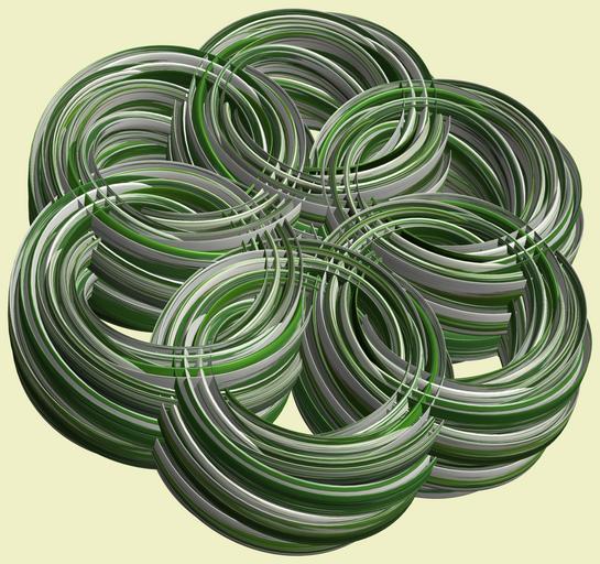 | Keywords: mathematica 3d cg parametricplot3d texture torus code program algorithm プログラム コード アルゴリズム 輪環 りんかん ドーナツ どーなつ トーラス とーらす knot 結び目 むすびめ mapping テクスチャ マッピング 模様 もよう design pattern デザイン パターン graphic グラフィック グラフィクス structure 意匠 構造 symmetry 対称性 たいしょうせい シンメトリー 対称 たいしょう indoor a = 6; (* center hole size of a torus *) b1 = 5;(* the number of angles *) b2 = 4;(* the number of waves *) b3 = 7; (* the number of knots *) c = 6; (* distance from the center of rotation *) d = 6; (* the number of tori *) h1 = 1; (* width of a torus *) h2 = 1; (* width of a torus *) h3 = 3; (* height of cross *) SetOptions[ParametricPlot3D, PlotRange -> Full, Mesh -> None, Boxed -> False, Axes -> None, PlotPoints -> 500, ImageSize -> 3000, Background -> RGBColor[{240, 240, 200}/255], PlotStyle -> Directive[Specularity[White, 50], Texture[Import["D:/tmp/911.jpg"]]], TextureCoordinateFunction -> ({#4, #5 /Pi} &), Lighting -> "Neutral"]; x = (a - h1 Cos[t] + h2 Sin[b1 s]) Cos[b3 s] + c; y = (a - h1 Cos[t] + h2 Sin[b1 s]) Sin[b3 s] + c; z = h3 Cos[b1 s] + Sin[b2 t] + c; rm = Table[{x, y, z}.RotationMatrix[2 i Pi/d, {0, 0, 1}], {i, d}]; ParametricPlot3D[rm, {t, 0, 2 Pi}, {s, 0, 2 Pi}] (*--- The Texture *) a = 6; (* center hole size of a torus *) b1 = 5;(* the number of angles *) b2 = 4;(* the number of waves *) b3 = 7; (* the number of knots *) c = 6; (* distance from the center of rotation *) d = 6; (* the number of tori *) h1 = 1; (* width of a torus *) h2 = 1; (* width of a torus *) h3 = 3; (* height of cross *) SetOptions[ParametricPlot3D, PlotRange -> Full, Mesh -> None, Boxed -> False, Axes -> None, PlotPoints -> 500, ImageSize -> 3000, Background -> RGBColor[{240, 240, 200}/255], PlotStyle -> Directive[Specularity[White, 50], Texture[Import["D:/tmp/911.jpg"]]], TextureCoordinateFunction -> ({#4, #5 /Pi} &), Lighting -> "Neutral"]; x = (a - h1 Cos[t] + h2 Sin[b1 s]) Cos[b3 s] + c; y = (a - h1 Cos[t] + h2 Sin[b1 s]) Sin[b3 s] + c; z = h3 Cos[b1 s] + Sin[b2 t] + c; rm = Table[{x, y, z}.RotationMatrix[2 i Pi/d, {0, 0, 1}], {i, d}]; ParametricPlot3D[rm, {t, 0, 2 Pi}, {s, 0, 2 Pi}] (*--- The Texture *) |