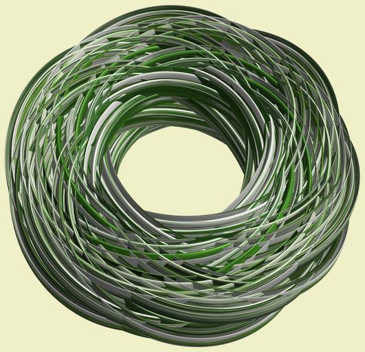 | Keywords: mathematica 3d cg parametricplot3d texture torus code program algorithm プログラム コード アルゴリズム 輪環 りんかん ドーナツ どーなつ トーラス とーらす knot 結び目 むすびめ mapping テクスチャ マッピング 模様 もよう design pattern デザイン パターン graphic グラフィック グラフィクス structure 意匠 構造 symmetry 対称性 たいしょうせい シンメトリー 対称 たいしょう circle round white background abstract a = 10; (* center hole size of a torus *) b1 = 5;(* the number of angles *) b2 = 4;(* the number of waves *) b3 = 4; (* the number of knots *) c = 2; (* distance from the center of rotation *) d = 6; (* the number of tori *) h1 = 1; (* width of a torus *) h2 = 1; (* width of a torus *) h3 = 3; (* height of cross *) SetOptions[ParametricPlot3D, PlotRange -> Full, Mesh -> None, Boxed -> False, Axes -> None, PlotPoints -> 500, ImageSize -> 3000, Background -> RGBColor[{240, 240, 200}/255], PlotStyle -> Directive[Specularity[White, 50], Texture[Import["D:/tmp/911.jpg"]]], TextureCoordinateFunction -> ({#4, #5 /Pi} &), Lighting -> "Neutral"]; x = (a - h1 Cos[t] + h2 Sin[b1 s]) Cos[b3 s] + c; y = (a - h1 Cos[t] + h2 Sin[b1 s]) Sin[b3 s] + c; z = h3 Cos[b1 s] + Sin[b2 t] + c; rm = Table[{x, y, z}.RotationMatrix[2 i Pi/d, {0, 0, 1}], {i, d}]; ParametricPlot3D[rm, {t, 0, 2 Pi}, {s, 0, 2 Pi}] (*--- The Texture *) a = 10; (* center hole size of a torus *) b1 = 5;(* the number of angles *) b2 = 4;(* the number of waves *) b3 = 4; (* the number of knots *) c = 2; (* distance from the center of rotation *) d = 6; (* the number of tori *) h1 = 1; (* width of a torus *) h2 = 1; (* width of a torus *) h3 = 3; (* height of cross *) SetOptions[ParametricPlot3D, PlotRange -> Full, Mesh -> None, Boxed -> False, Axes -> None, PlotPoints -> 500, ImageSize -> 3000, Background -> RGBColor[{240, 240, 200}/255], PlotStyle -> Directive[Specularity[White, 50], Texture[Import["D:/tmp/911.jpg"]]], TextureCoordinateFunction -> ({#4, #5 /Pi} &), Lighting -> "Neutral"]; x = (a - h1 Cos[t] + h2 Sin[b1 s]) Cos[b3 s] + c; y = (a - h1 Cos[t] + h2 Sin[b1 s]) Sin[b3 s] + c; z = h3 Cos[b1 s] + Sin[b2 t] + c; rm = Table[{x, y, z}.RotationMatrix[2 i Pi/d, {0, 0, 1}], {i, d}]; ParametricPlot3D[rm, {t, 0, 2 Pi}, {s, 0, 2 Pi}] (*--- The Texture *) |