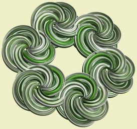| Keywords: mathematica 3d cg parametricplot3d texture torus code program algorithm プログラム コード アルゴリズム 輪環 りんかん ドーナツ どーなつ トーラス とーらす knot 結び目 むすびめ mapping テクスチャ マッピング 模様 もよう design pattern デザイン パターン graphic グラフィック グラフィクス structure 意匠 構造 symmetry 対称性 たいしょうせい シンメトリー 対称 たいしょう drawing indoor white background tangle a = 6; (* center hole size of a torus *) b1 = 5;(* the number of angles *) b2 = 4;(* the number of waves *) b3 = 4; (* the number of knots *) c = 14; (* distance from the center of rotation *) d = 6; (* the number of tori *) h1 = 3; (* width of a torus *) h2 = 4; (* width of a torus *) h3 = 3; (* height of cross *) SetOptions[ParametricPlot3D, PlotRange -> Full, Mesh -> None, Boxed -> False, Axes -> None, PlotPoints -> 500, ImageSize -> 3000, Background -> RGBColor[{240, 240, 200}/255], PlotStyle -> Directive[Specularity[White, 50], Texture[Import["D:/tmp/911.jpg"]]], TextureCoordinateFunction -> ({#4, #5 /Pi} &), Lighting -> "Neutral"]; x = (a - h1 Cos[t] + h2 Sin[b1 s]) Cos[b3 s] + c; y = (a - h1 Cos[t] + h2 Sin[b1 s]) Sin[b3 s] + c; z = h3 Cos[b1 s] + Sin[b2 t] + c; rm = Table[{x, y, z}.RotationMatrix[2 i Pi/d, {0, 0, 1}], {i, d}]; ParametricPlot3D[rm, {t, 0, 2 Pi}, {s, 0, 2 Pi}] (*--- The Texture *) a = 6; (* center hole size of a torus *) b1 = 5;(* the number of angles *) b2 = 4;(* the number of waves *) b3 = 4; (* the number of knots *) c = 14; (* distance from the center of rotation *) d = 6; (* the number of tori *) h1 = 3; (* width of a torus *) h2 = 4; (* width of a torus *) h3 = 3; (* height of cross *) SetOptions[ParametricPlot3D, PlotRange -> Full, Mesh -> None, Boxed -> False, Axes -> None, PlotPoints -> 500, ImageSize -> 3000, Background -> RGBColor[{240, 240, 200}/255], PlotStyle -> Directive[Specularity[White, 50], Texture[Import["D:/tmp/911.jpg"]]], TextureCoordinateFunction -> ({#4, #5 /Pi} &), Lighting -> "Neutral"]; x = (a - h1 Cos[t] + h2 Sin[b1 s]) Cos[b3 s] + c; y = (a - h1 Cos[t] + h2 Sin[b1 s]) Sin[b3 s] + c; z = h3 Cos[b1 s] + Sin[b2 t] + c; rm = Table[{x, y, z}.RotationMatrix[2 i Pi/d, {0, 0, 1}], {i, d}]; ParametricPlot3D[rm, {t, 0, 2 Pi}, {s, 0, 2 Pi}] (*--- The Texture *) |