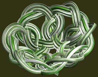 | Keywords: mathematica 3d cg parametricplot3d texture torus code program algorithm プログラム コード アルゴリズム 輪環 りんかん ドーナツ どーなつ トーラス とーらす knot 結び目 むすびめ mapping テクスチャ マッピング 模様 もよう design pattern デザイン パターン graphic グラフィック グラフィクス structure 意匠 構造 symmetry 対称性 たいしょうせい シンメトリー 対称 たいしょう tangle indoor a = 12; (* center hole size of a torus *) b1 = 5; (* the number of angles *) b2 = 4; (* the number of waves *) b3 = 2; (* the number of knots *) c = 22; (* distance from the center of rotation *) d = 6; (* the number of tori *) h1 = 3; (* width of a torus *) h2 = 2; (* width of a torus *) h3 = 3; (* height of cross *) SetOptions[ParametricPlot3D, PlotRange -> Full, Mesh -> None, Boxed -> False, Axes -> None, PlotPoints -> 500, ImageSize -> 3000, Background -> RGBColor[{50, 50, 20}/255], PlotStyle -> Directive[Specularity[White, 50], Texture[Import["D:/tmp/911.jpg"]]], TextureCoordinateFunction -> ({#4, #5 /Pi} &), Lighting -> "Neutral"]; x = (a - h1 Cos[t] + h2 Sin[b1 s]) Cos[b3 s]; y = (a - h1 Cos[t] + h2 Sin[b1 s]) Sin[b3 s]; z = h3 Cos[b1 s] + Sin[b2 t] + c; rm = Table[{x, y, z}.RotationMatrix[2 i Pi/d, {1, 0, 1}], {i, d}]; ParametricPlot3D[rm, {t, 0, 2 Pi}, {s, 0, 2 Pi}] (*--- The Texture *) a = 12; (* center hole size of a torus *) b1 = 5; (* the number of angles *) b2 = 4; (* the number of waves *) b3 = 2; (* the number of knots *) c = 22; (* distance from the center of rotation *) d = 6; (* the number of tori *) h1 = 3; (* width of a torus *) h2 = 2; (* width of a torus *) h3 = 3; (* height of cross *) SetOptions[ParametricPlot3D, PlotRange -> Full, Mesh -> None, Boxed -> False, Axes -> None, PlotPoints -> 500, ImageSize -> 3000, Background -> RGBColor[{50, 50, 20}/255], PlotStyle -> Directive[Specularity[White, 50], Texture[Import["D:/tmp/911.jpg"]]], TextureCoordinateFunction -> ({#4, #5 /Pi} &), Lighting -> "Neutral"]; x = (a - h1 Cos[t] + h2 Sin[b1 s]) Cos[b3 s]; y = (a - h1 Cos[t] + h2 Sin[b1 s]) Sin[b3 s]; z = h3 Cos[b1 s] + Sin[b2 t] + c; rm = Table[{x, y, z}.RotationMatrix[2 i Pi/d, {1, 0, 1}], {i, d}]; ParametricPlot3D[rm, {t, 0, 2 Pi}, {s, 0, 2 Pi}] (*--- The Texture *) |