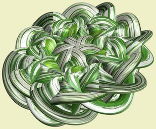 | Keywords: mathematica 3d cg parametricplot3d texture torus code program algorithm プログラム コード アルゴリズム 輪環 りんかん ドーナツ どーなつ トーラス とーらす knot 結び目 むすびめ design pattern デザイン パターン graphic グラフィック グラフィクス structure 意匠 構造 symmetry 対称性 たいしょうせい シンメトリー 対称 たいしょう indoor white background drawing a = 6; (* center hole size of a torus *) b1 = 5;(* the number of angles *) b2 = 2;(* the number of waves *) b3 = 3; (* the number of knots *) c = 8; (* distance from the center of rotation *) d = 6; (* the number of tori *) h1 = 5; (* width of a torus *) h2 = 2; (* width of a torus *) h3 = 5; (* height of cross *) SetOptions[ParametricPlot3D, PlotRange -> Full, Mesh -> None, Boxed -> False, Axes -> None, PlotPoints -> 500, ImageSize -> 3000, Background -> RGBColor[{240, 240, 200}/255], PlotStyle -> Directive[Specularity[White, 50], Texture[Import["D:/tmp/911.jpg"]]], TextureCoordinateFunction -> ({#4, #5 /Pi} &), Lighting -> "Neutral"]; x = (a - h1 Cos[t] + h2 Sin[b1 s]) Cos[b3 s] + c; y = (a - h1 Cos[t] + h2 Sin[b1 s]) Sin[b3 s] + c; z = h3 Cos[b1 s] + Sin[b2 t] + c; rm = Table[{x, y, z}.RotationMatrix[2 i Pi/d, {0, 0, 1}], {i, d}]; ParametricPlot3D[rm, {t, 0, 2 Pi}, {s, 0, 2 Pi}] (*--- The Texture *) a = 6; (* center hole size of a torus *) b1 = 5;(* the number of angles *) b2 = 2;(* the number of waves *) b3 = 3; (* the number of knots *) c = 8; (* distance from the center of rotation *) d = 6; (* the number of tori *) h1 = 5; (* width of a torus *) h2 = 2; (* width of a torus *) h3 = 5; (* height of cross *) SetOptions[ParametricPlot3D, PlotRange -> Full, Mesh -> None, Boxed -> False, Axes -> None, PlotPoints -> 500, ImageSize -> 3000, Background -> RGBColor[{240, 240, 200}/255], PlotStyle -> Directive[Specularity[White, 50], Texture[Import["D:/tmp/911.jpg"]]], TextureCoordinateFunction -> ({#4, #5 /Pi} &), Lighting -> "Neutral"]; x = (a - h1 Cos[t] + h2 Sin[b1 s]) Cos[b3 s] + c; y = (a - h1 Cos[t] + h2 Sin[b1 s]) Sin[b3 s] + c; z = h3 Cos[b1 s] + Sin[b2 t] + c; rm = Table[{x, y, z}.RotationMatrix[2 i Pi/d, {0, 0, 1}], {i, d}]; ParametricPlot3D[rm, {t, 0, 2 Pi}, {s, 0, 2 Pi}] (*--- The Texture *) |