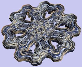 | Keywords: mathematica 3d cg parametricplot3d texture torus code program algorithm プログラム コード アルゴリズム 輪環 りんかん ドーナツ どーなつ トーラス とーらす mapping テクスチャ マッピング 模様 もよう abstract 抽象 ちゅうしょう アブストラクト design pattern デザイン パターン graphic グラフィック グラフィクス structure 意匠 構造 symmetry 対称性 たいしょうせい シンメトリー 対称 たいしょう indoor white background surreal a = 7; (* center hole size of a torus *) b1 = 6;(* the number of angles *) b2 = 6;(* the number of waves *) c = 7; (* distance from the center of rotation *) d = 6; (* the number of tori *) h1 = 3; (* width of a torus *) h2 = 1; (* width of a torus *) SetOptions[ParametricPlot3D, PlotRange -> Full, Mesh -> None, Boxed -> False, Axes -> None, PlotPoints -> 500, ImageSize -> 3000, Background -> RGBColor[{200, 200, 240}/255], PlotStyle -> Directive[Specularity[White, 70], Texture[Import["D:/tmp/94.jpg"]]], TextureCoordinateFunction -> ({#4, #5 Pi} &), Lighting -> "Neutral"]; f[v_] := Sin[2 Sin[Sin[Sin[v]]]]; x = (a - h1 Cos[t] + h2 f[b1 s]) Cos[s] + c; y = (a - h1 Cos[t] + h2 f[b1 s]) Sin[s] + c; z = f[b2 t]; rm = Table[{x, y, z}.RotationMatrix[2 i Pi/d, {1, 0, 0}], {i, d}]; ParametricPlot3D[rm, {t, 0, 2 Pi}, {s, 0, 2 Pi}] (*--- The Texture *) a = 7; (* center hole size of a torus *) b1 = 6;(* the number of angles *) b2 = 6;(* the number of waves *) c = 7; (* distance from the center of rotation *) d = 6; (* the number of tori *) h1 = 3; (* width of a torus *) h2 = 1; (* width of a torus *) SetOptions[ParametricPlot3D, PlotRange -> Full, Mesh -> None, Boxed -> False, Axes -> None, PlotPoints -> 500, ImageSize -> 3000, Background -> RGBColor[{200, 200, 240}/255], PlotStyle -> Directive[Specularity[White, 70], Texture[Import["D:/tmp/94.jpg"]]], TextureCoordinateFunction -> ({#4, #5 Pi} &), Lighting -> "Neutral"]; f[v_] := Sin[2 Sin[Sin[Sin[v]]]]; x = (a - h1 Cos[t] + h2 f[b1 s]) Cos[s] + c; y = (a - h1 Cos[t] + h2 f[b1 s]) Sin[s] + c; z = f[b2 t]; rm = Table[{x, y, z}.RotationMatrix[2 i Pi/d, {1, 0, 0}], {i, d}]; ParametricPlot3D[rm, {t, 0, 2 Pi}, {s, 0, 2 Pi}] (*--- The Texture *) |
