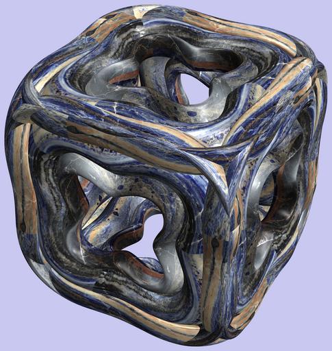 | Keywords: mathematica 3d cg parametricplot3d texture torus code program algorithm プログラム コード アルゴリズム 輪環 りんかん ドーナツ どーなつ トーラス とーらす mapping テクスチャ マッピング 模様 もよう abstract 抽象 ちゅうしょう アブストラクト design pattern デザイン パターン graphic グラフィック グラフィクス structure 意匠 構造 symmetry 対称性 たいしょうせい シンメトリー 対称 たいしょう surreal drawing painting white background animal photo border ancient a = 7; (* center hole size of a torus *) b1 = 4;(* the number of angles *) b2 = 3;(* the number of waves *) c = 8; (* distance from the center of rotation *) d = 6; (* the number of tori *) h1 = 3; (* width of a torus *) h2 = 1; (* width of a torus *) SetOptions[ParametricPlot3D, PlotRange -> Full, Mesh -> None, Boxed -> False, Axes -> None, PlotPoints -> 500, ImageSize -> 3000, Background -> RGBColor[{200, 200, 240}/255], PlotStyle -> Directive[Specularity[White, 70], Texture[Import["D:/tmp/94.jpg"]]], TextureCoordinateFunction -> ({#4, #5 Pi} &), Lighting -> "Neutral"]; x = (a - h1 Cos[t] + h2 Sin[b1 s]) Cos[s + Pi/(2 b1)]; y = (a - h1 Cos[t] + h2 Sin[b1 s]) Sin[s + Pi/(2 b1)]; z = Sin[b2 t] + c; vc = {{0, 0, 1}, {0, 0, -1}, {0, 1, 0}, {0, -1, 0}, {1, 0, 0}, {-1, 0, 0}}; rm = Table[{x, y, z}.RotationMatrix[{{0, 0, 1}, vc[[i]]}], {i, d}]; ParametricPlot3D[rm, {t, 0, 2 Pi}, {s, 0, 2 Pi}] (*--- The Texture *) a = 7; (* center hole size of a torus *) b1 = 4;(* the number of angles *) b2 = 3;(* the number of waves *) c = 8; (* distance from the center of rotation *) d = 6; (* the number of tori *) h1 = 3; (* width of a torus *) h2 = 1; (* width of a torus *) SetOptions[ParametricPlot3D, PlotRange -> Full, Mesh -> None, Boxed -> False, Axes -> None, PlotPoints -> 500, ImageSize -> 3000, Background -> RGBColor[{200, 200, 240}/255], PlotStyle -> Directive[Specularity[White, 70], Texture[Import["D:/tmp/94.jpg"]]], TextureCoordinateFunction -> ({#4, #5 Pi} &), Lighting -> "Neutral"]; x = (a - h1 Cos[t] + h2 Sin[b1 s]) Cos[s + Pi/(2 b1)]; y = (a - h1 Cos[t] + h2 Sin[b1 s]) Sin[s + Pi/(2 b1)]; z = Sin[b2 t] + c; vc = {{0, 0, 1}, {0, 0, -1}, {0, 1, 0}, {0, -1, 0}, {1, 0, 0}, {-1, 0, 0}}; rm = Table[{x, y, z}.RotationMatrix[{{0, 0, 1}, vc[[i]]}], {i, d}]; ParametricPlot3D[rm, {t, 0, 2 Pi}, {s, 0, 2 Pi}] (*--- The Texture *) |
