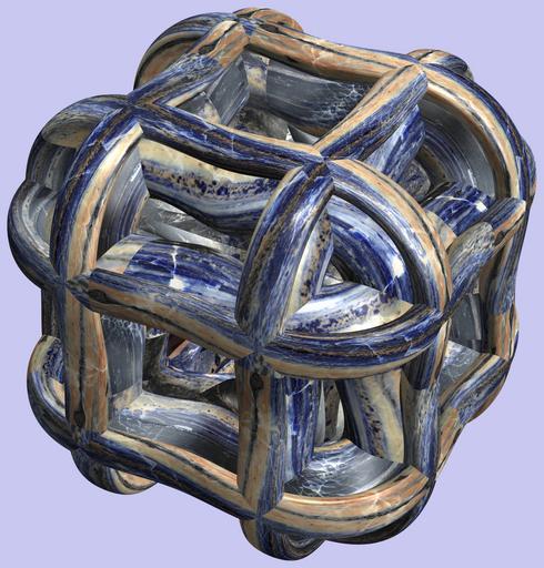| Keywords: mathematica 3d cg parametricplot3d texture torus code program algorithm プログラム コード アルゴリズム 輪環 りんかん ドーナツ どーなつ トーラス とーらす mapping テクスチャ マッピング 模様 もよう abstract 抽象 ちゅうしょう アブストラクト design pattern デザイン パターン graphic グラフィック グラフィクス structure 意匠 構造 symmetry 対称性 たいしょうせい シンメトリー 対称 たいしょう ancient drawing white background wheel surreal photo border a = 7; (* center hole size of a torus *) b1 = 4;(* the number of angles *) b2 = 3;(* the number of waves *) c = 4; (* distance from the center of rotation *) d = 6; (* the number of tori *) h1 = 3; (* width of a torus *) h2 = 1; (* width of a torus *) SetOptions[ParametricPlot3D, PlotRange -> Full, Mesh -> None, Boxed -> False, Axes -> None, PlotPoints -> 500, ImageSize -> 3000, Background -> RGBColor[{200, 200, 240}/255], PlotStyle -> Directive[Specularity[White, 70], Texture[Import["D:/tmp/94.jpg"]]], TextureCoordinateFunction -> ({#4, #5 Pi} &), Lighting -> "Neutral"]; x = (a - h1 Cos[t] + h2 Sin[b1 s]) Cos[s + Pi/(2 b1)]; y = (a - h1 Cos[t] + h2 Sin[b1 s]) Sin[s + Pi/(2 b1)]; z = Sin[b2 t] + c; vc = {{0, 0, 1}, {0, 0, -1}, {0, 1, 0}, {0, -1, 0}, {1, 0, 0}, {-1, 0, 0}}; rm = Table[{x, y, z}.RotationMatrix[{{0, 0, 1}, vc[[i]]}], {i, d}]; ParametricPlot3D[rm, {t, 0, 2 Pi}, {s, 0, 2 Pi}] (*--- The Texture *) a = 7; (* center hole size of a torus *) b1 = 4;(* the number of angles *) b2 = 3;(* the number of waves *) c = 4; (* distance from the center of rotation *) d = 6; (* the number of tori *) h1 = 3; (* width of a torus *) h2 = 1; (* width of a torus *) SetOptions[ParametricPlot3D, PlotRange -> Full, Mesh -> None, Boxed -> False, Axes -> None, PlotPoints -> 500, ImageSize -> 3000, Background -> RGBColor[{200, 200, 240}/255], PlotStyle -> Directive[Specularity[White, 70], Texture[Import["D:/tmp/94.jpg"]]], TextureCoordinateFunction -> ({#4, #5 Pi} &), Lighting -> "Neutral"]; x = (a - h1 Cos[t] + h2 Sin[b1 s]) Cos[s + Pi/(2 b1)]; y = (a - h1 Cos[t] + h2 Sin[b1 s]) Sin[s + Pi/(2 b1)]; z = Sin[b2 t] + c; vc = {{0, 0, 1}, {0, 0, -1}, {0, 1, 0}, {0, -1, 0}, {1, 0, 0}, {-1, 0, 0}}; rm = Table[{x, y, z}.RotationMatrix[{{0, 0, 1}, vc[[i]]}], {i, d}]; ParametricPlot3D[rm, {t, 0, 2 Pi}, {s, 0, 2 Pi}] (*--- The Texture *) |