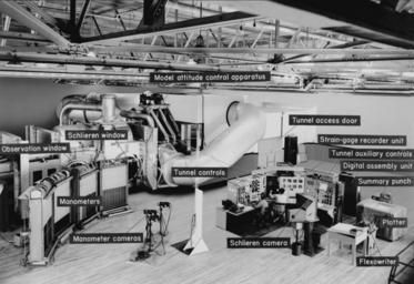 | Keywords: blackandwhite monochrome indoor black and white (A-21175.1): This view of the 6- x 6-Foot Supersonic Wind Tunnel’s roomy test chamber identifies the control and data acquisition system components. The tunnel’s test section is in the left background, with its flow from left to right. (A-21175.1): This view of the 6- x 6-Foot Supersonic Wind Tunnel’s roomy test chamber identifies the control and data acquisition system components. The tunnel’s test section is in the left background, with its flow from left to right. |